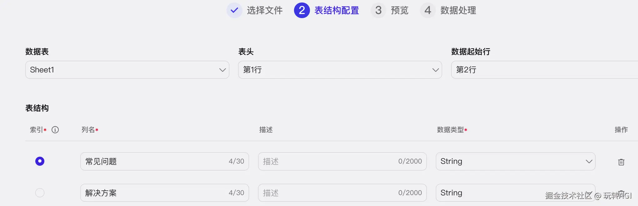 - 配置表格结构,将用户问题配置为索引列,然后单击下一步。