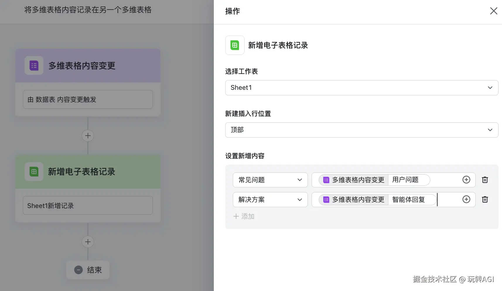 - 删除第二个节点,参考上述步骤,添加新增电子表格记录事件。