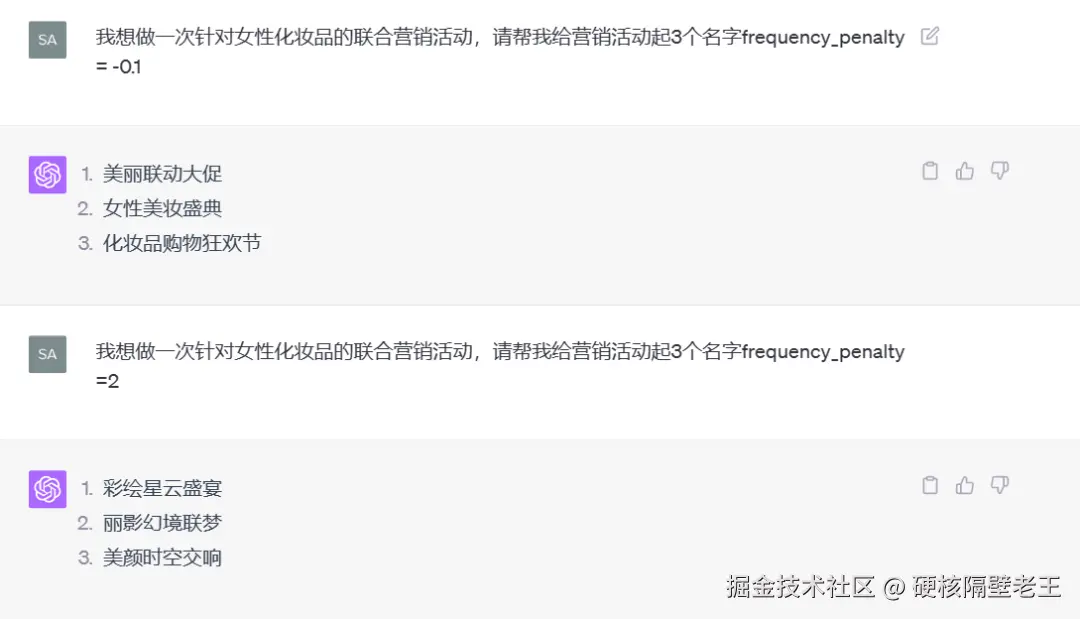 frequency_penalty:1 至 2,用于产生各种独特的短语和想法。