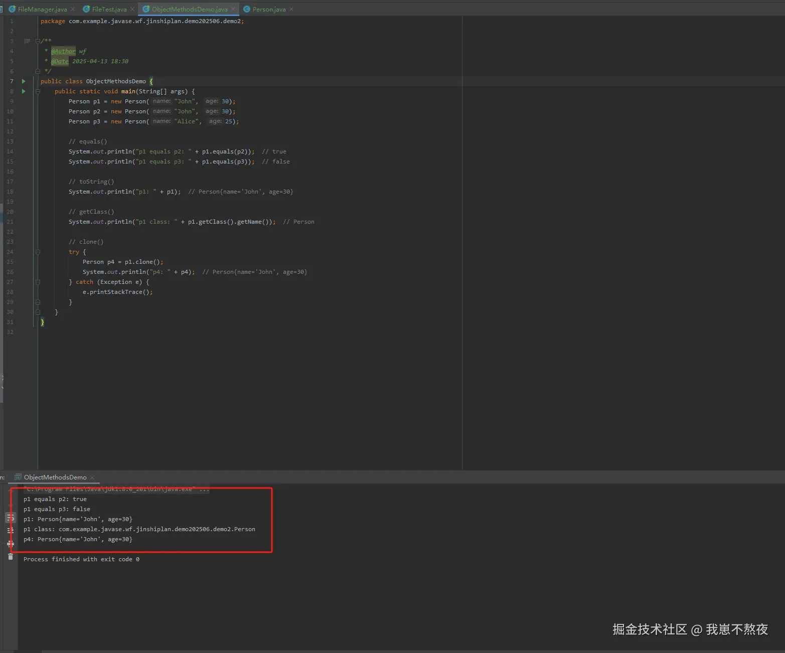 根据如上我所给出的案例demo,着重进行代码解析,希望能够辅助大家理解。如上这段代码我目的是为了展示 Object 类的一些常用方法,特别是 equals()、toString()、getClass() 和 clone() 方法的使用,以及如何在自定义类中实现这些方法。代码包含两个类:ObjectMethodsDemo 和 Person,分别用于展示方法的使用和定义。