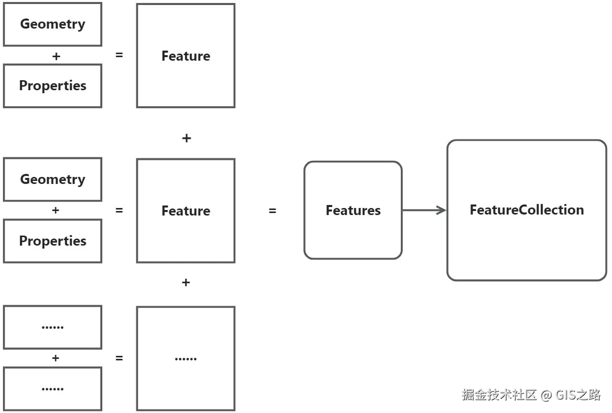要素FeatureCollection对象type属性为"FeatureCollection",由features数组构成。元素是Feature对象。