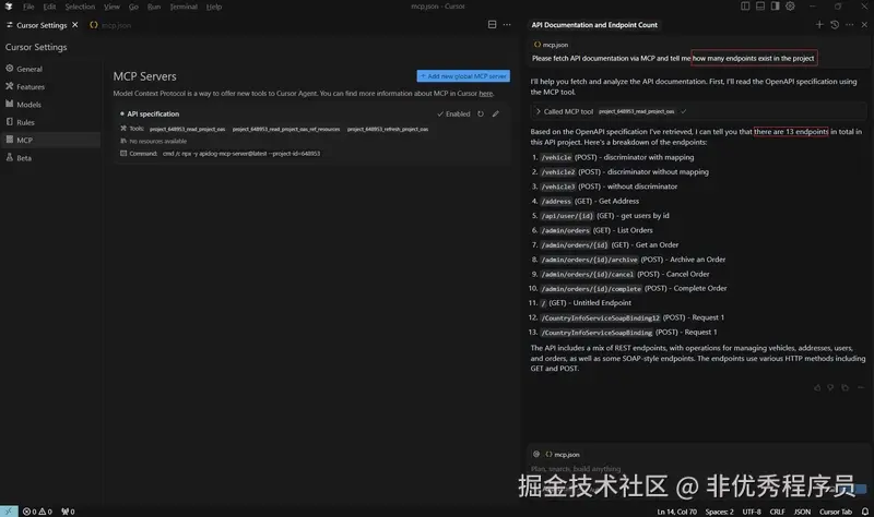 与通用上下文插件不同,Apidog 专注于让您的 OpenAPI 规范、端点数据和架构详细信息能够立即被 AI 访问。想要生成 TypeScript 接口或基于您的真实端点构建 Python 客户端吗?只需咨询 Cursor——它已经了解您的 API 结构。