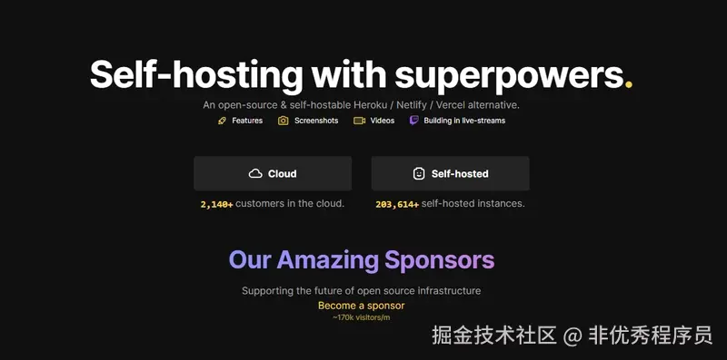 Coolify 是 Heroku 或 Vercel 等平台的完全开源替代方案。它允许您部署全栈应用程序、静态站点、数据库和工作器,而无需编写 Dockerfile 或 NGINX 配置。