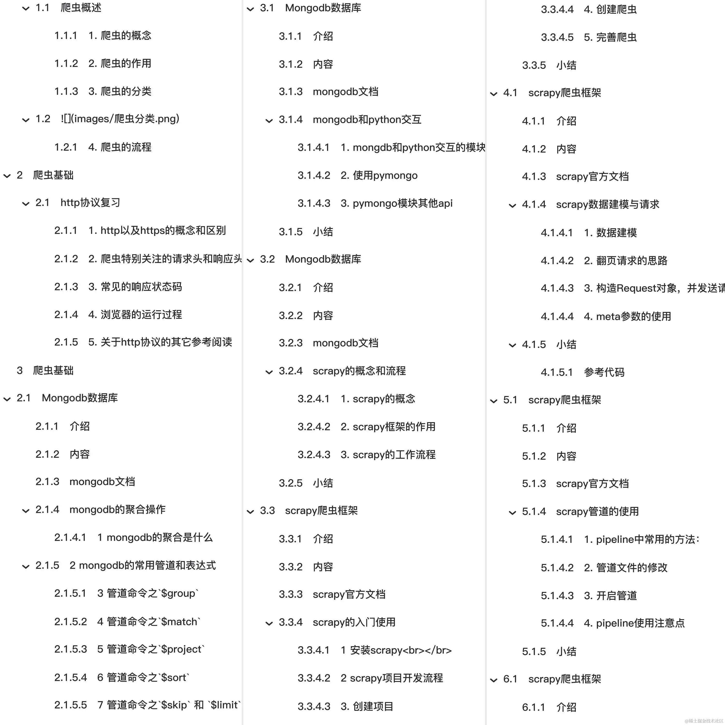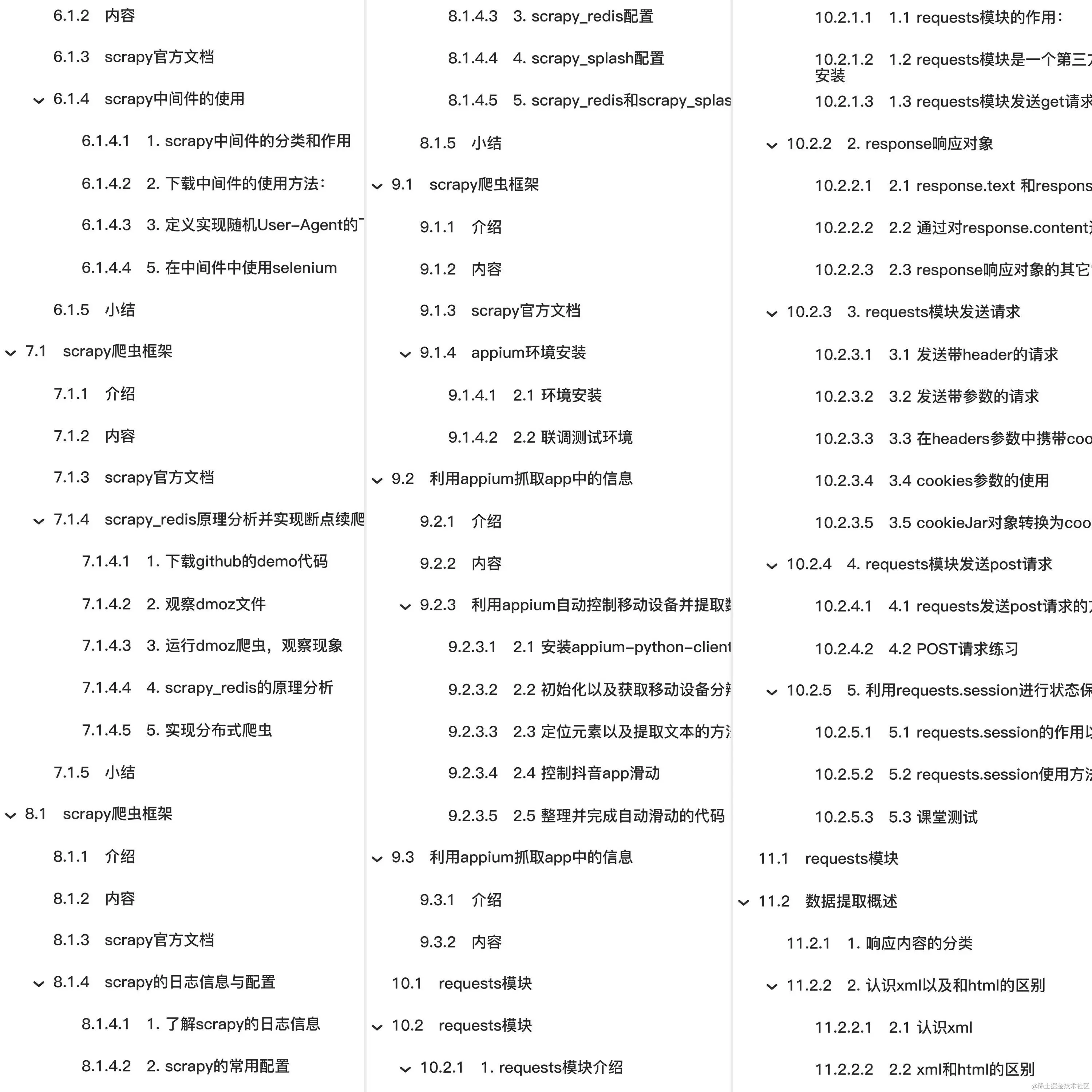 爬虫基础 http协议复习 1. http以及https的概念和区别 2. 爬虫特别关注的请求头和响应头 3. 常见的响应状态码 4. 浏览器的运行过程 5. 关于http协议的其它参考阅读 Mongodb数据库 介绍 内容 mongodb的聚合操作 2 mongodb的常用管道和表达式 3 管道命令之$group 7 管道命令之$skip 和 $limit 8 小结 小结 scrapy爬虫框架 利用appium抓取app中的信息 利用appium自动控制移动设备并提取数据 2.1 安装appium-python-client模块并启动已安装好的环境 2.2 初始化以及获取移动设备分辨率 2.3 定位元素以及提取文本的方法 2.4 控制抖音app滑动 2.5 整理并完成自动滑动的代码 2.6 关于模拟式移动端爬虫的参考阅读 requests模块 数据提取概述 1. 响应内容的分类 2. 认识xml以及和html的区别 2.1 认识xml 2.3 常用数据解析方法 数据提取-jsonpath模块 1. jsonpath模块的使用场景 数据提取-lxml模块 1. 了解 lxml模块和xpath语法 2. 谷歌浏览器xpath helper插件的安装和使用 3. xpath的节点关系 4. xpath语法-基础节点选择语法 4.1 xpath定位节点以及提取属性或文本内容的语法 4.2 语法练习 7. lxml模块的安装与使用示例 7.2 爬虫对html提取的内容 8 练习 10. lxml模块中etree.tostring函数的使用 10.1 现象和结论 selenium的介绍 1. selenium运行效果展示 3. selenium的安装以及简单使用 获取当前标签页的全部cookie信息 把cookie转化为字典 删除所有的cookie 显式等待 参数20表示最长等待20秒 参数0.5表示0.5秒检查一次规定的标签是否存在 EC.presence_of_element_located((By.LINK_TEXT, '好123')) 表示通过链接文本内容定位标签 每0.5秒一次检查,通过链接文本内容定位标签是否存在,如果存在就向下继续执行;如果不存在,直到20秒上限就抛出异常 i = 0 while True: options.set_headles() # 无界面模式的另外一种开启方式 反爬与反反爬 常见的反爬手段和解决思路 1 服务器反爬的原因 2 服务器常反什么样的爬虫 3 反爬虫领域常见的一些概念 4 反爬的三个方向 5 常见基于身份识别进行反爬