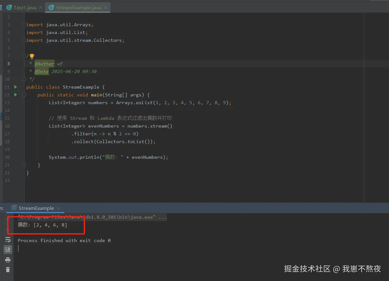 - System.out.println("偶数: " + evenNumbers); 打印筛选出的偶数列表。