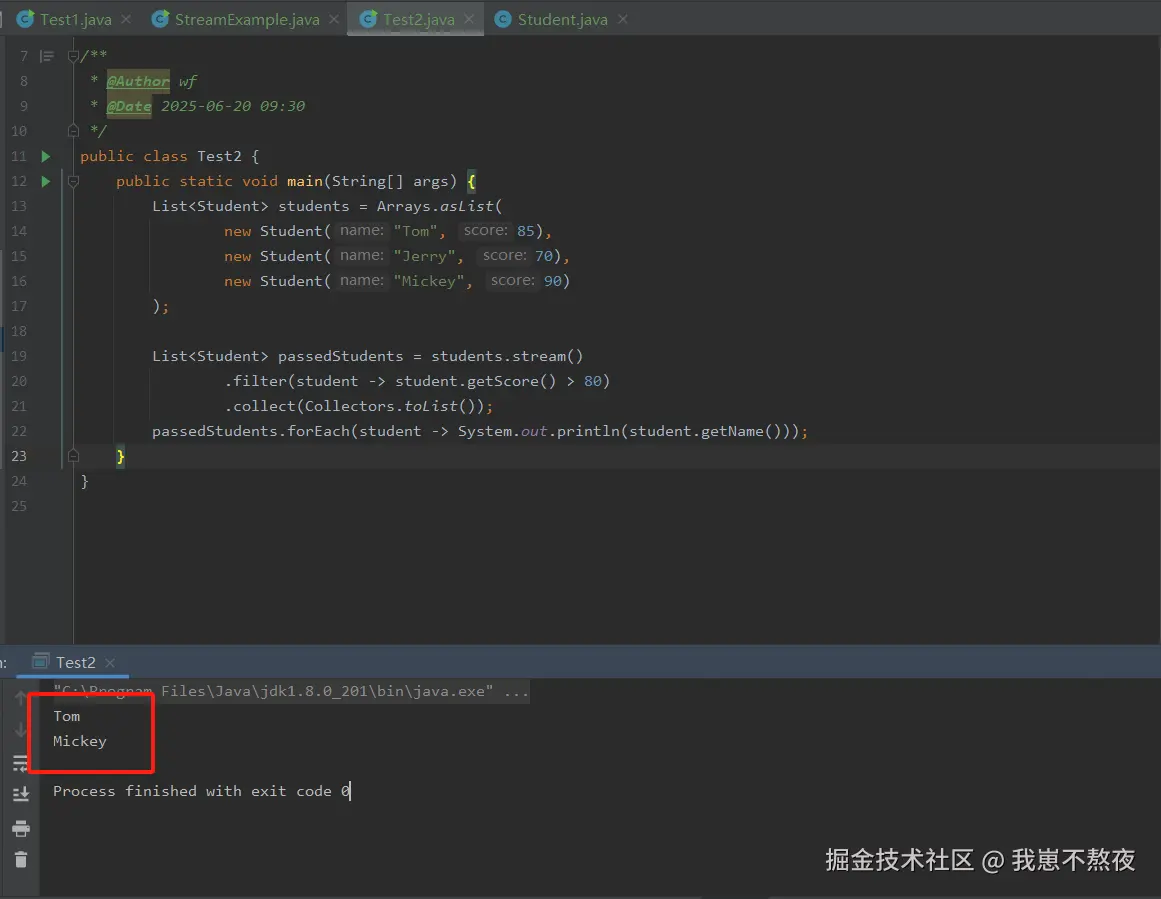 - passedStudents.forEach(student -> System.out.println(student.getName())); 遍历筛选后的学生列表,并打印学生姓名。