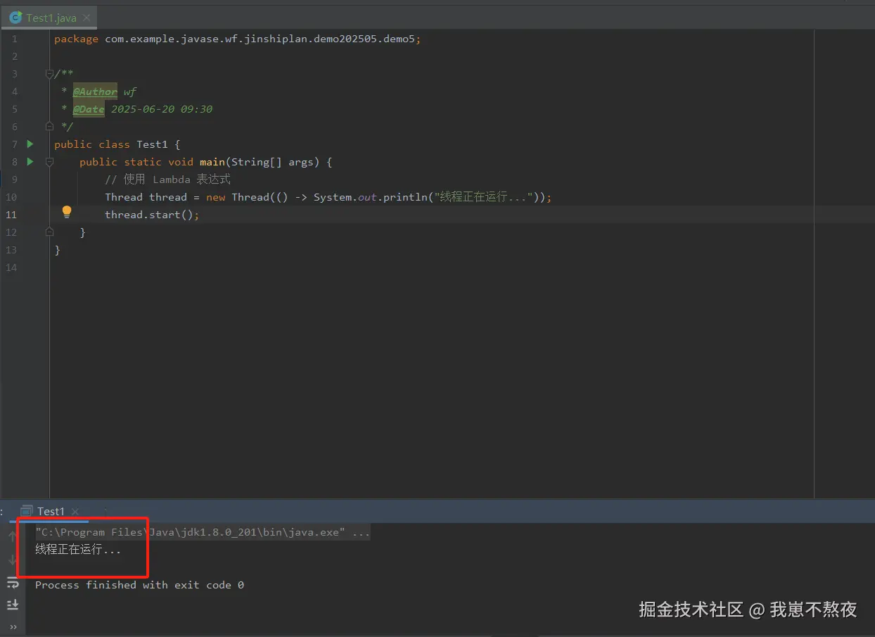 只用一行简洁的代码,我们就完成了线程的创建和启动。相比传统的匿名类写法,Lambda 表达式让代码更加简洁、可读性更强,也避免了冗长的类声明。