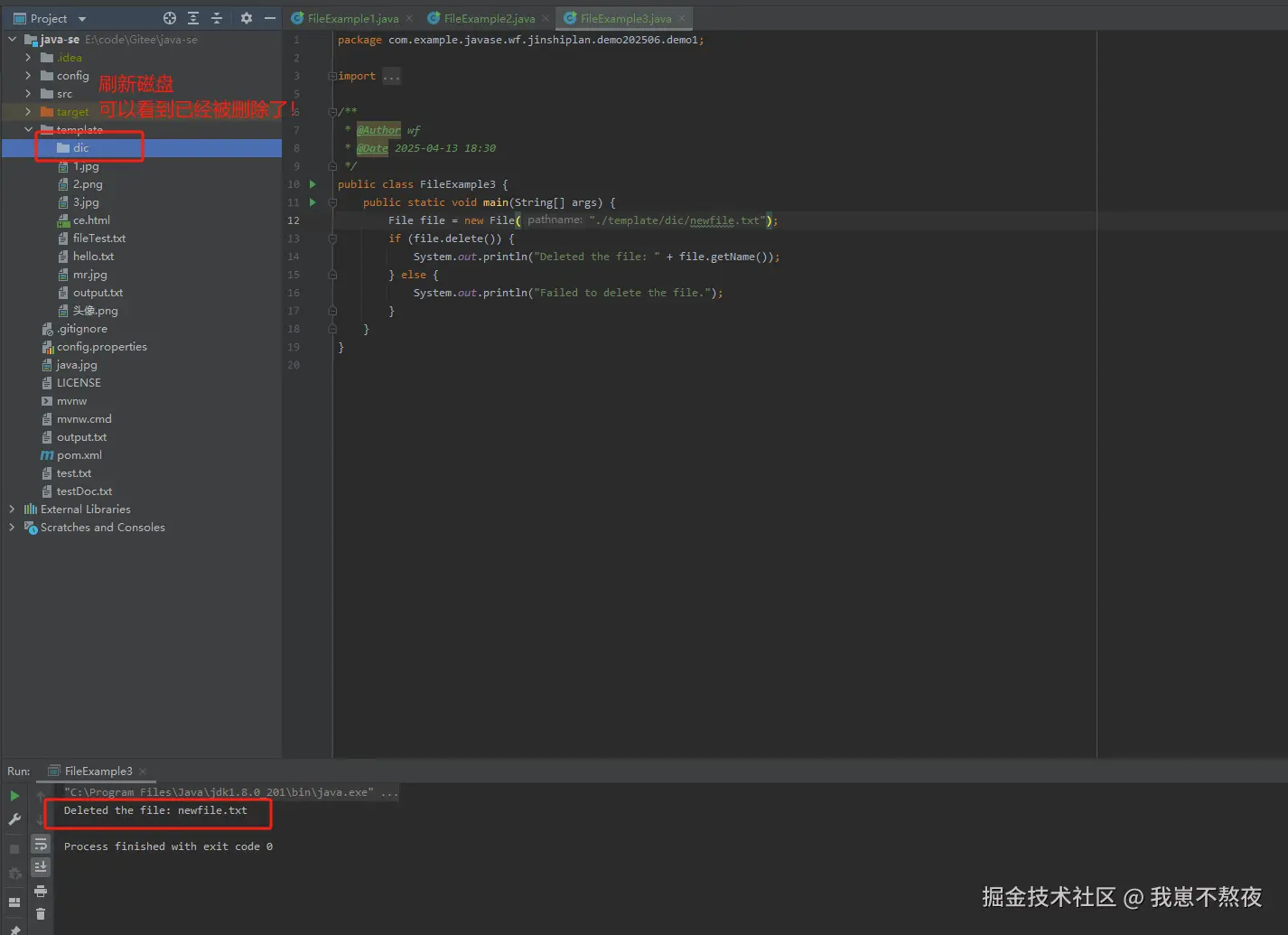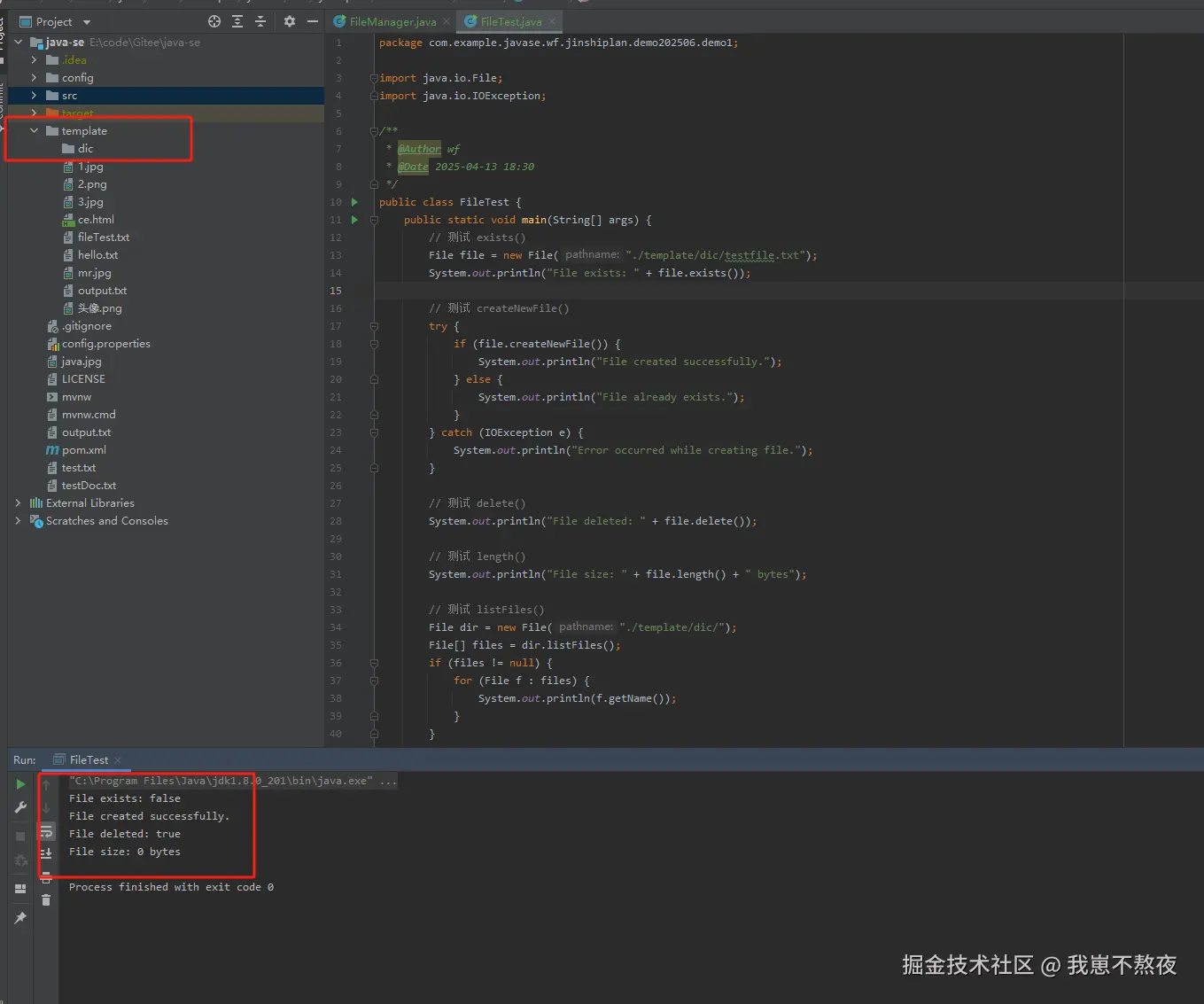 createNewFile()方法帮助创建一个新文件,并返回创建是否成功的标志。 - 文件删除: