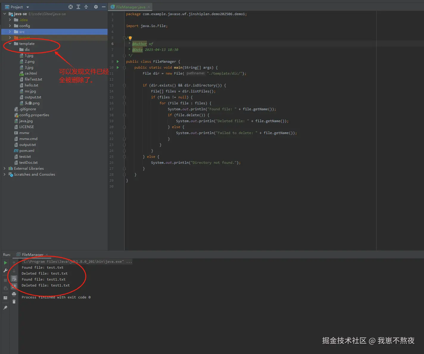 for循环遍历files数组中的每一个文件或子目录,使用getName()获取文件的名称,并打印出文件的名字。 file.delete()用来删除每一个文件。如果文件成功删除,打印出“Deleted file: 文件名”;如果删除失败,打印“Failed to delete: 文件名”。删除失败的原因可能是文件正在被其他程序占用,或文件权限问题。