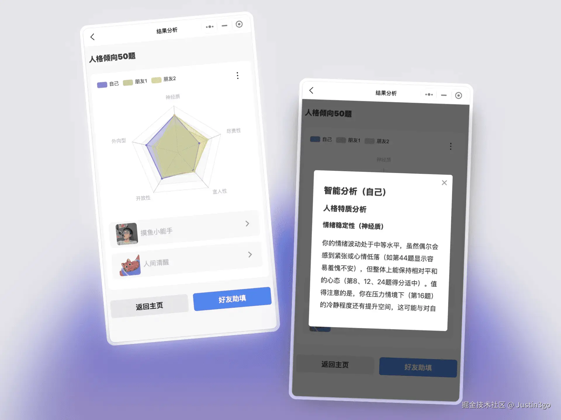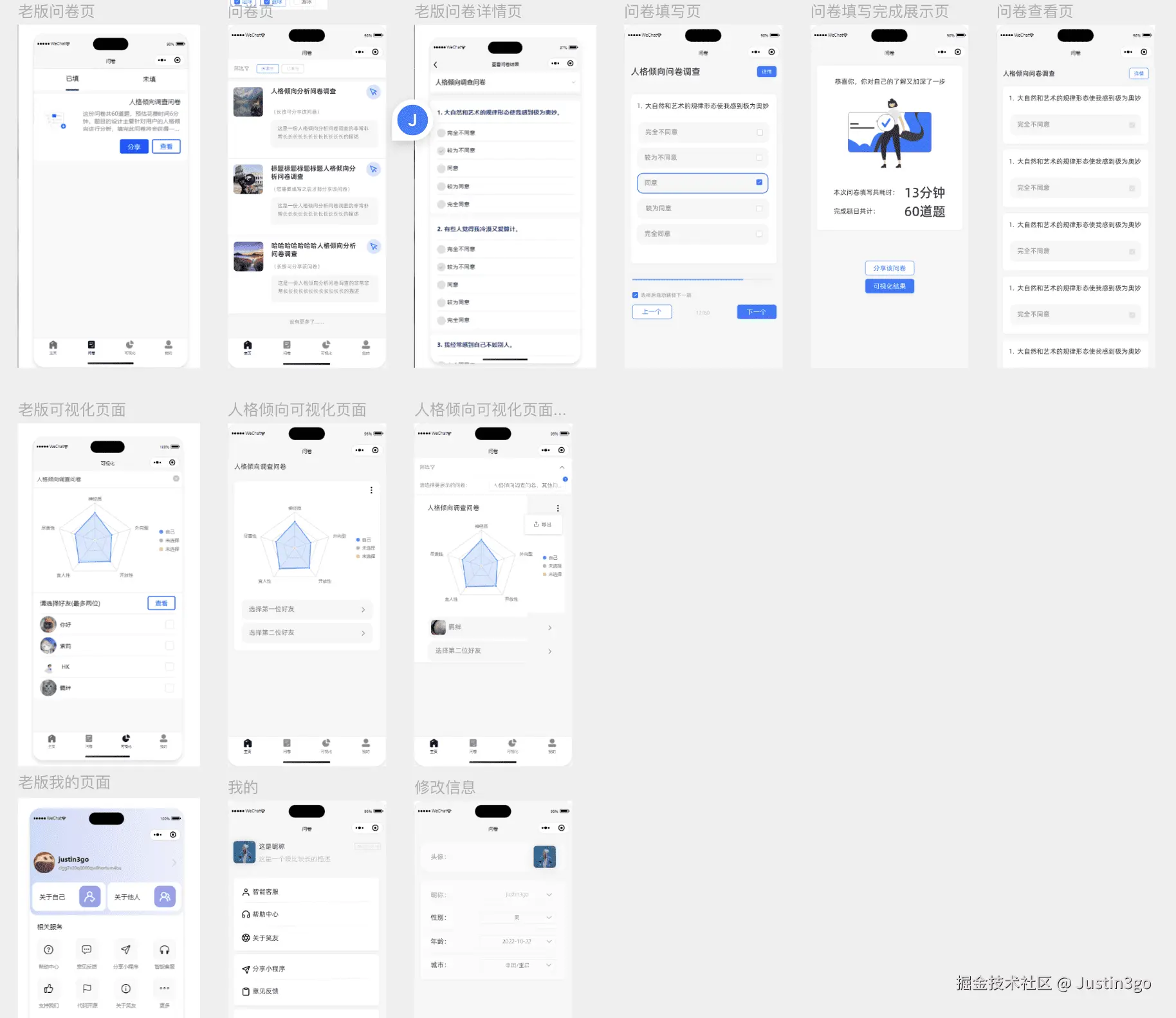 功能上,主要功能保持不变,去除了以前AI对话的功能,去除了几乎没啥用的主页等等一些冗余页面,做了一些减法,即减少工作量,又不至于过多页面拖垮用户的注意力。其次,除了以前的公式计算问卷结果之外,还增加了AI智能分析问卷结果并给出积极建议的小功能。