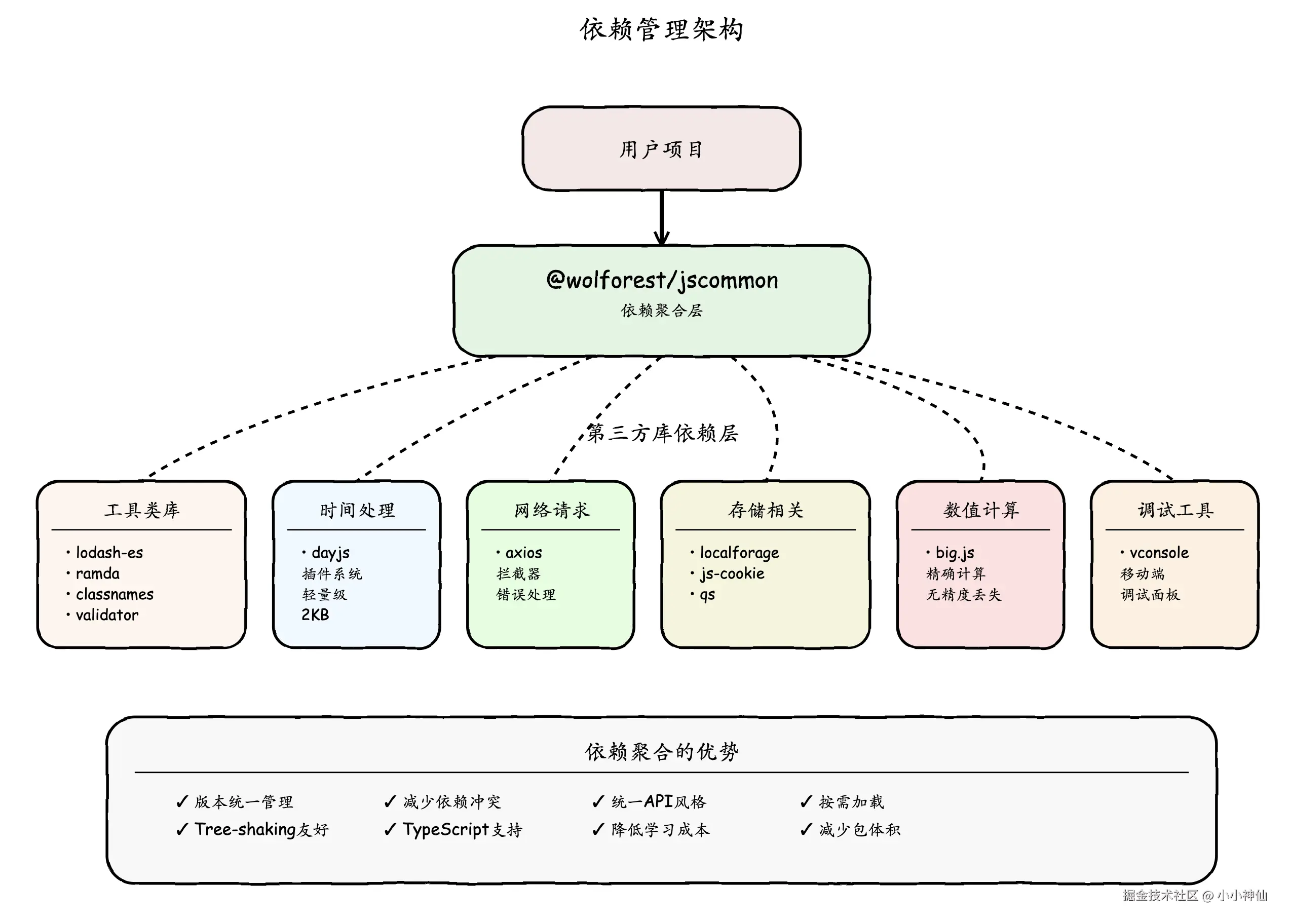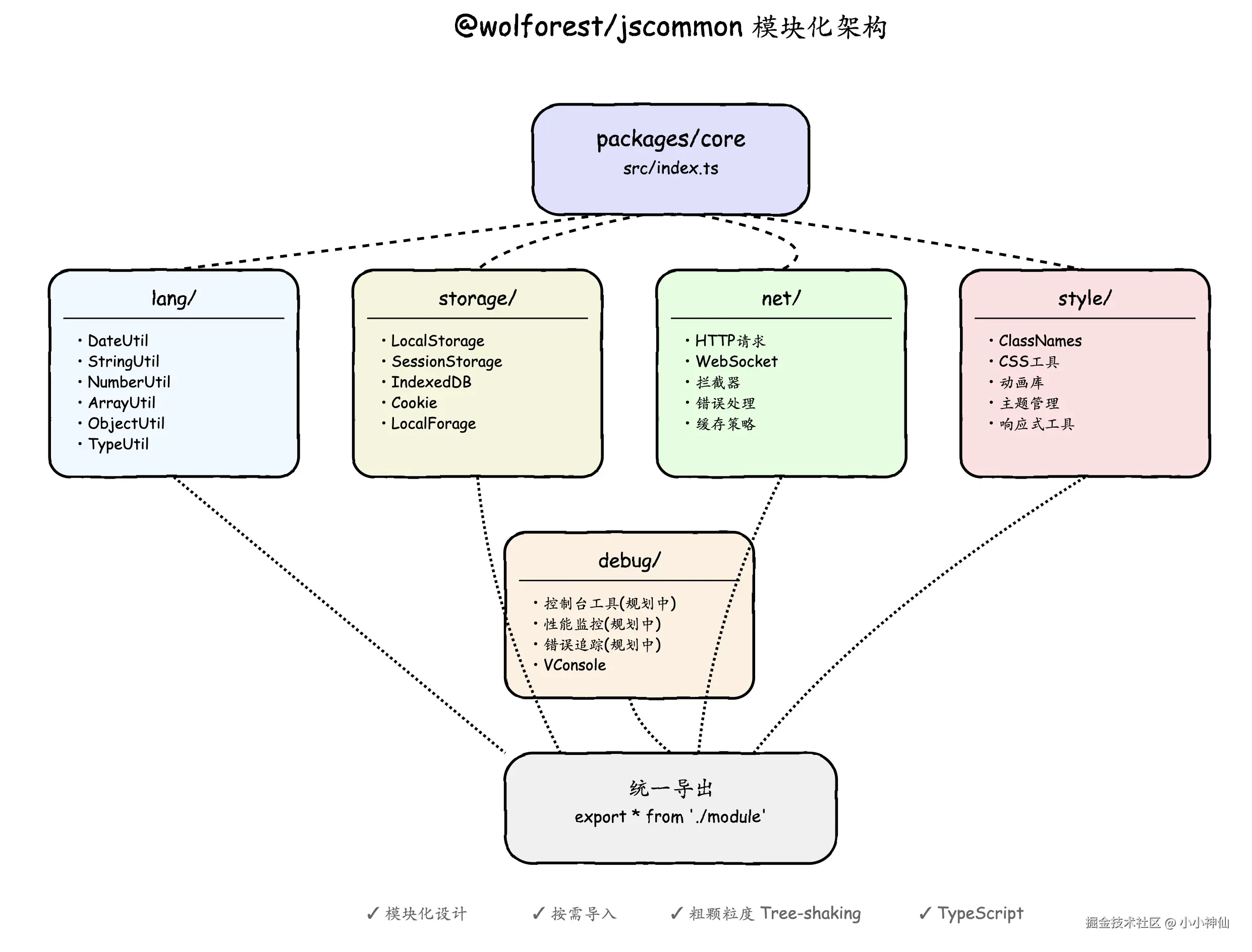 基于我们在 @wolforest/jscommon 中的实践,总结出以下架构设计原则: