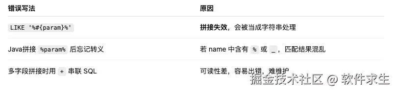 这种方式也能成功模糊查询,但缺点是:你在 Java 层拼接了字符串,如果多个字段都要模糊匹配,拼接过程容易出错,还可能有注入风险。