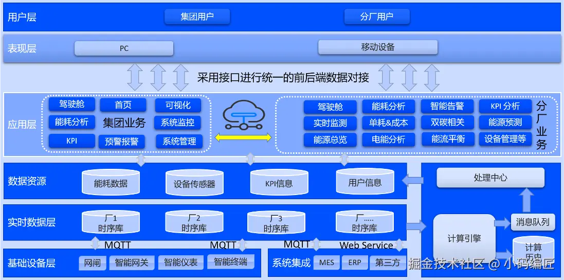 负责从物联网设备采集能耗数据并写入时序数据库。相关实现可参考我们另一仓库中的 MQTT采集网关(链接需替换),也可参考 ThingsJS 等知名开源项目,或使用 Netty 自行开发。