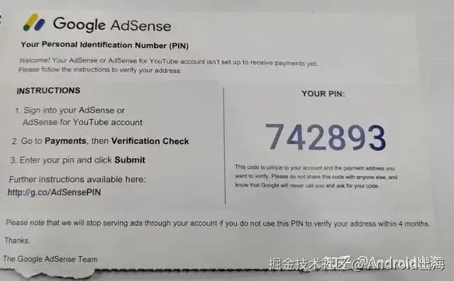 当广告收入达到 10 美元(或等值本地货币)时,谷歌就会寄出包含 PIN 码的信件。这 PIN 码就如同开启付款通道的钥匙,只有拿到并正确使用它,后续的收益才能顺利到账。
