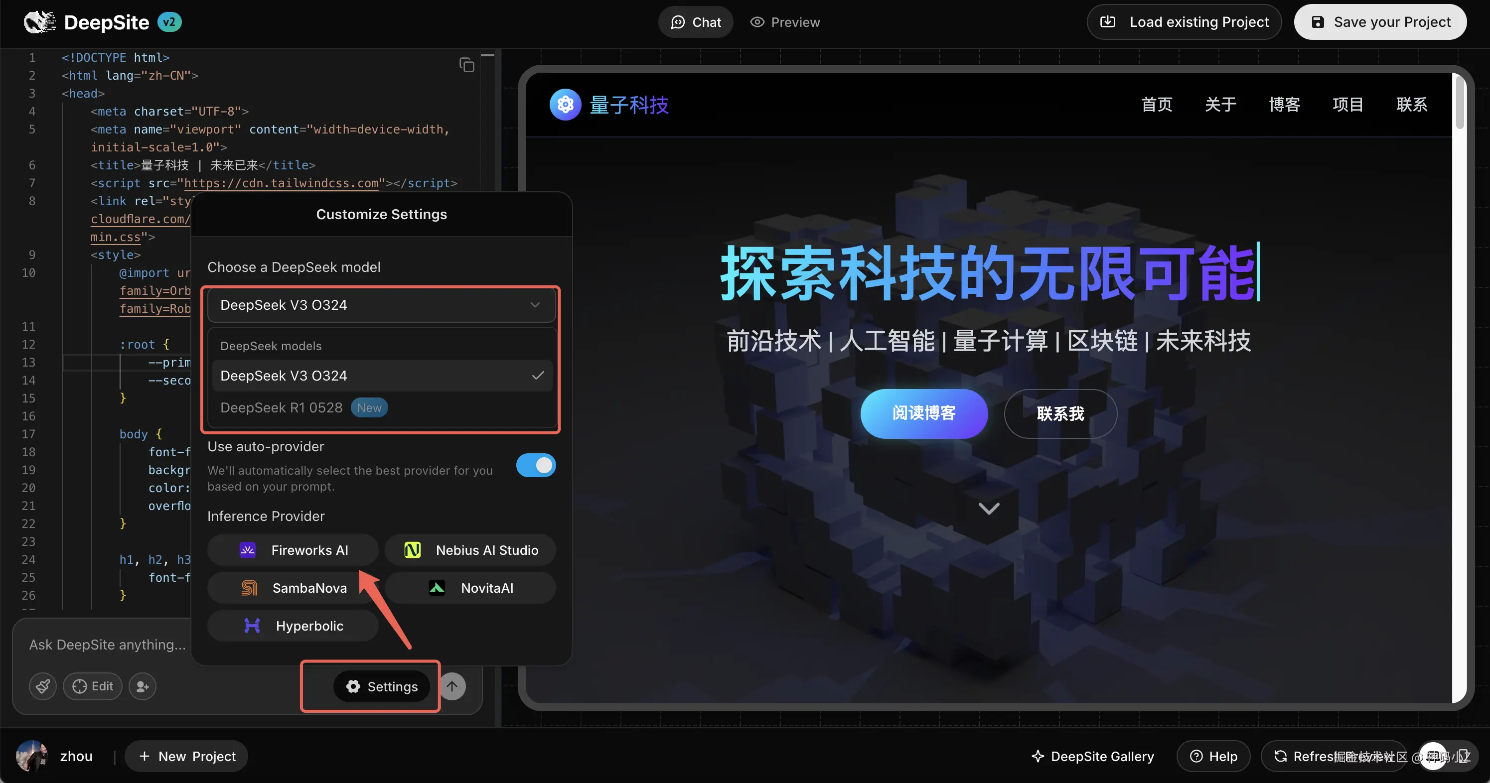 用户可以在设置中选择不同的AI模型,包括最新的DeepSeek R1-0528,以及Fireworks AI、NovitaAI等推理引擎,根据需求选择最合适的生成效果。