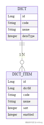 | Dict | 字典主表,存储字典编码、名称、数据类型等元信息 |