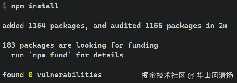 在执行 npm install 后,终端通常会打印出三部分核心信息:新增包的数量、审计包的数量以及安装所用的时间;紧接着若有依赖包启用了资助(funding)功能,还会提示可运行 npm fund 查看详情。新增包数量代表安装的直接依赖和所有子依赖总和 ,审计包数量则反映出对刚安装的依赖进行安全检查时扫描的包总数 ,安装时长则是一项性能指标,用于评估安装过程的耗时 。当看到“packages are looking for funding”提示时,意味着当前项目所依赖的某些开源库显式声明了资金支持需求,用户可以选择运行 npm fund 跟进捐助链接 。