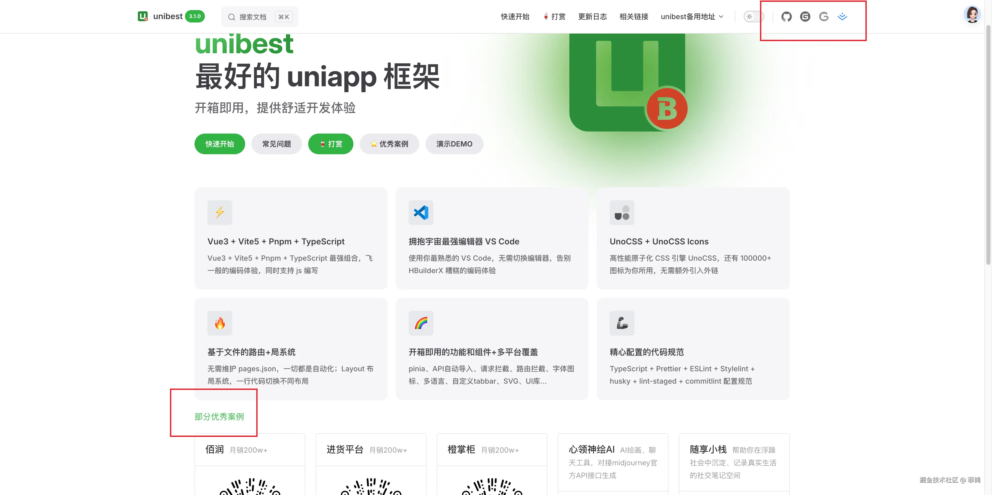 如上图,最底部还有 “优秀案例” 的展示,如果您有好的案例也可以在 issue: 📳 Unibest 优秀案例征集!诚邀您的参与 #139 中填写,我会不定期整理进去。