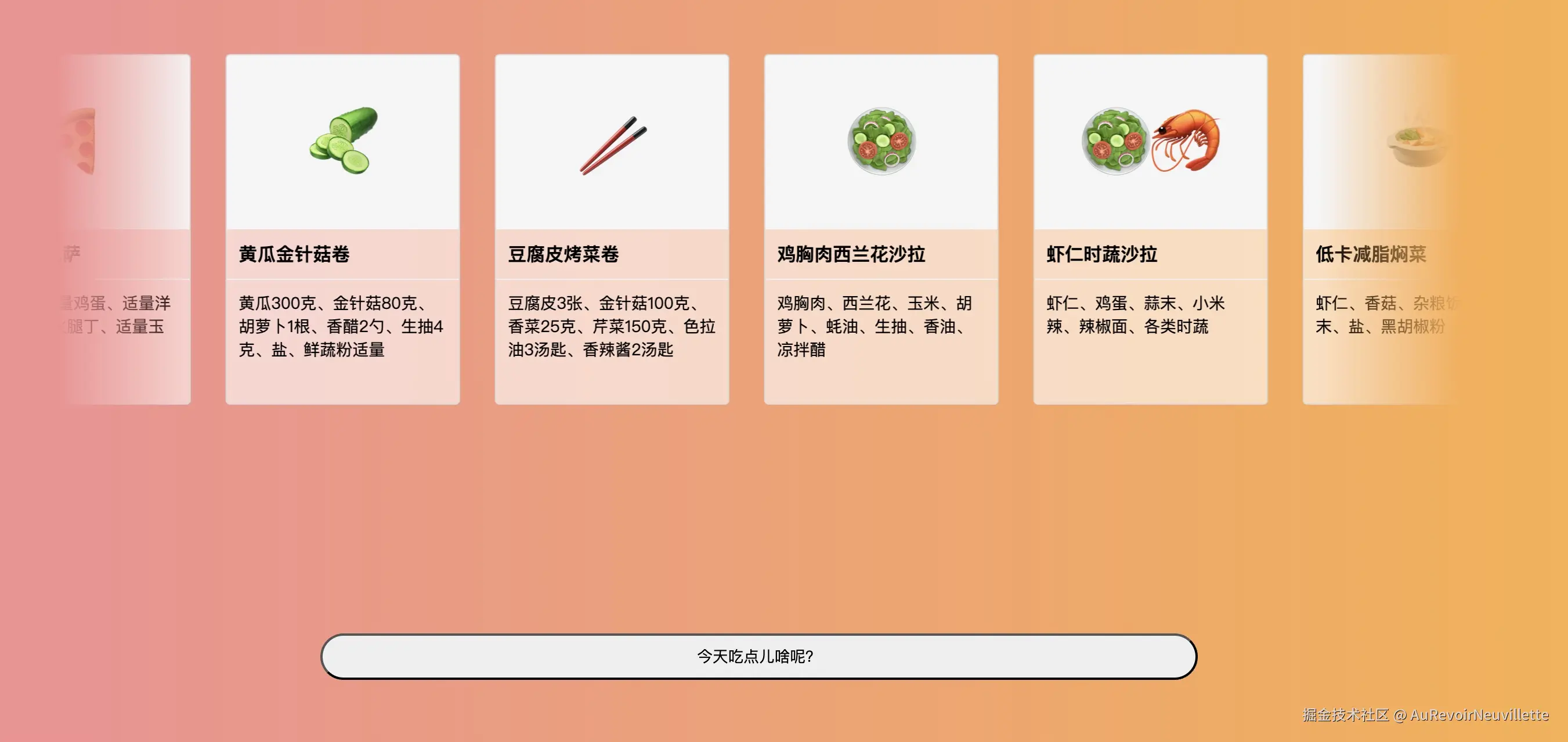 #开发一个随机生成减脂餐菜谱的Web应用<功能描述>从已经有的约100+预设好的减脂餐菜谱中由用户随机抽选三个菜谱作为今天的减脂餐,做到营养均衡、美味、低卡、颜值高。</功能描述><页面描述> 页面内容处于视窗正中央,分为“菜谱行”和“操作行”部分。卡片、按钮边框采用ant-design组件库的默认样式。 <菜谱行:initialState> [布局]:宽度占据80vw,高度占据60vh,采用flex布局方式, 均匀地排放所有“菜谱卡片”组件。 其中,“菜谱卡片”组件: <菜谱卡片> 大小:高度300px;宽度:200px; 构成:从上到下三个部分:1.一个菜谱图片,高度150px。2.一个菜谱名称,font-weight:bold。 3.原材料列表 </菜谱卡片> [动画]:菜谱卡片从右到左按每秒20px的速度匀速从右向左进行循环位移。 </菜谱行:initialState> <操作行> 按钮:‘今天吃点儿啥呢?’ 按钮事件绑定:点击后会暂停<菜谱行:initialState>的[动画]。 </操作行></页面描述><数据来源> 请按照以下步骤整理数据: 1.搜索关键字,比如‘美味减脂餐’、‘低卡餐’、‘简单易做的健康餐’来爬取数据。需要收集100份。 2.收集到的数据需要整理成以下的字面量对象: {recipeName:'填入菜品名',recipeDetails:'填入菜品原材料'}</数据来源>请根据我提供的描述进行开发。