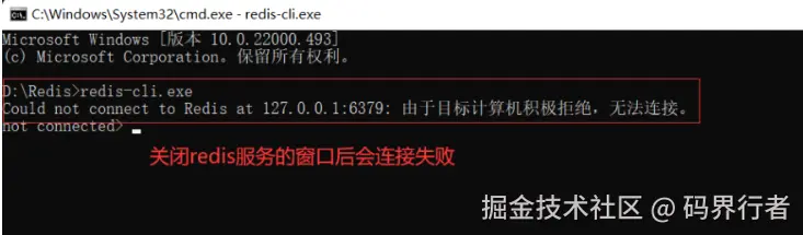如果出现连接不成功,注意服务打开以后,另启一个 cmd 窗口到Redis所在的目录执行命令,原来的Redis启动窗口不要关闭,不然就无法访问服务端了。