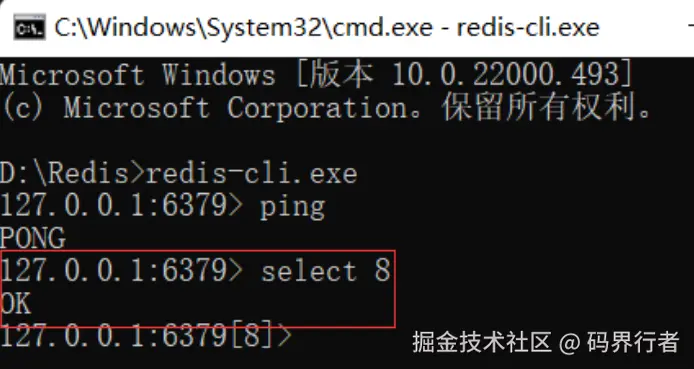 select 8 ---redis:默认拥有16个数据库,初始默认使用0号库,在命令行中通过select命令将数据库切换到8号数据库