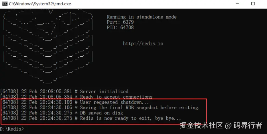 在Redis服务启动的cmd窗口中会出现服务关闭的提醒,如下图: