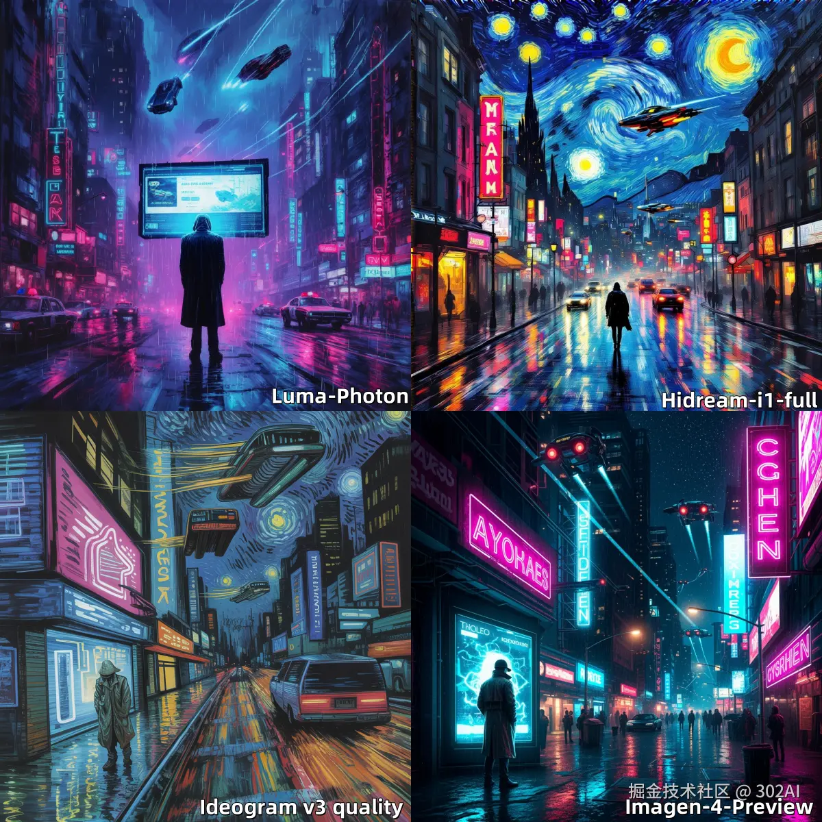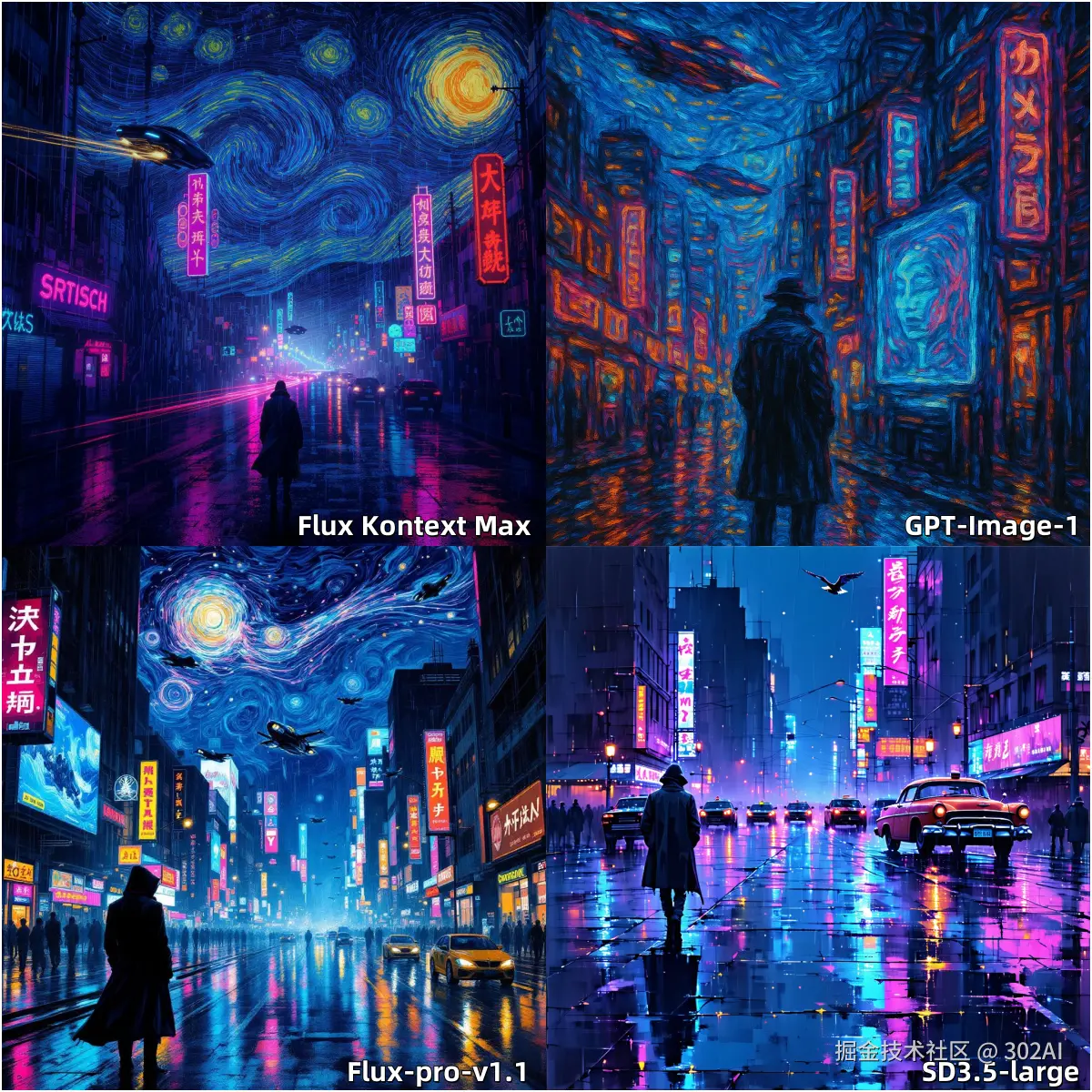 - 风格化呈现: 需要将两种截然不同的艺术风格 ———— 赛博朋克(Cyberpunk)和梵高(Van Gogh)的 "星月夜" ———— 进行融合。这不仅需要模型理解两种风格各自的视觉特征(赛博朋克的霓虹灯、雨后的街道、飞行器、全息广告;梵高的旋涡状笔触、鲜艳的色彩对比),还需要将其有机地结合起来,创造出一种全新的视觉语言。
