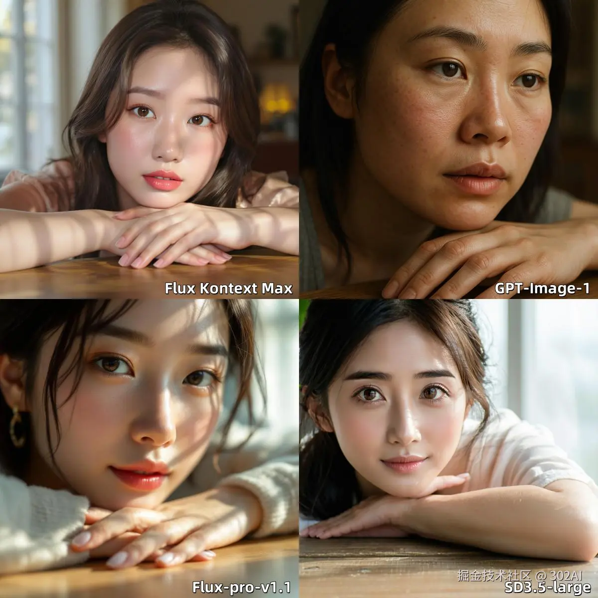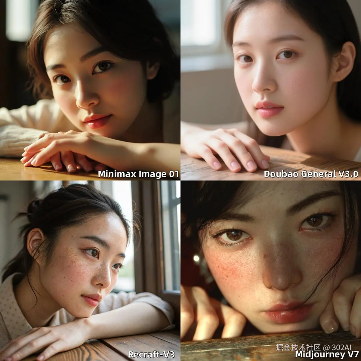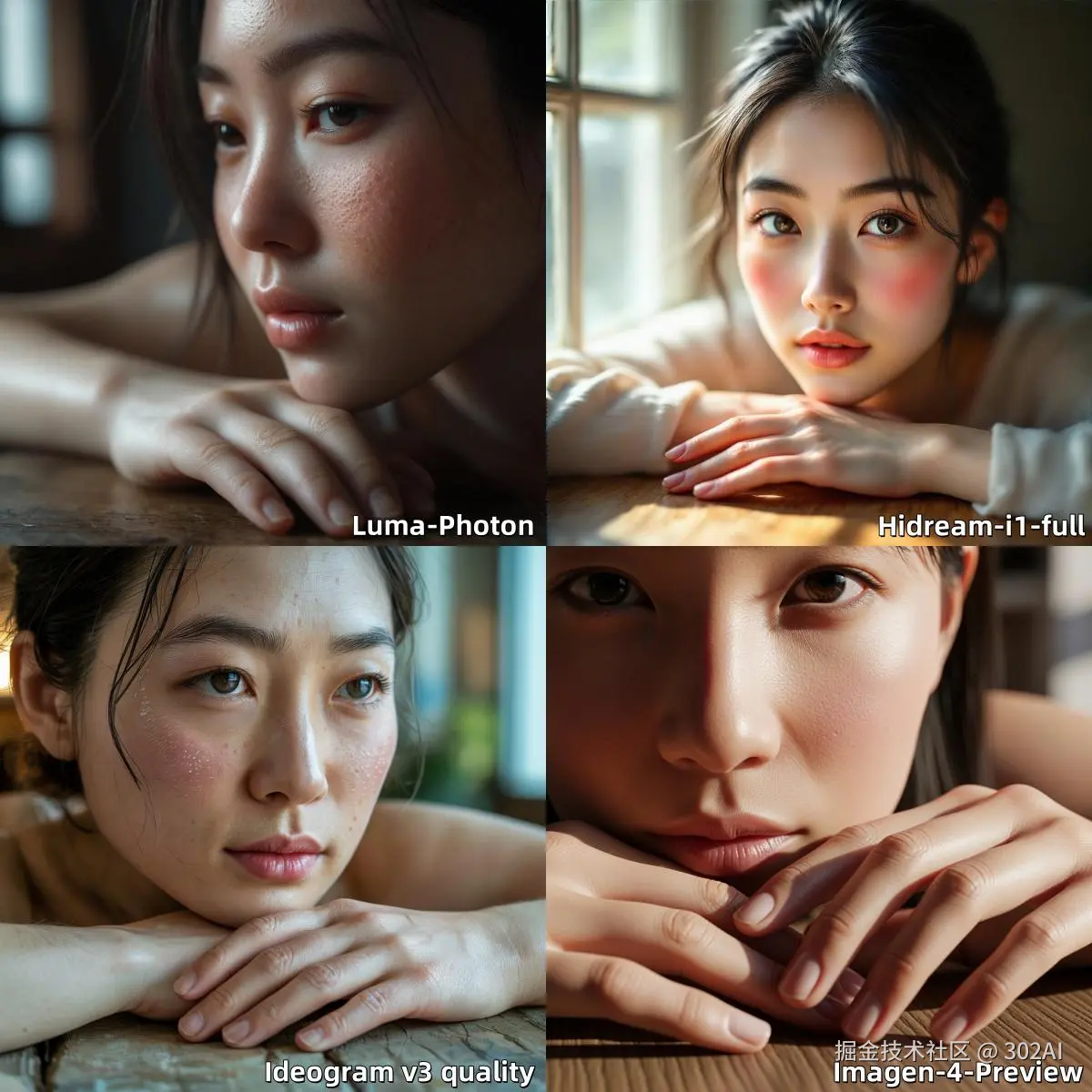 参考翻译:一位亚洲年轻女性的超写实特写肖像,沐浴在柔和、定向的窗户光线中。她的皮肤纹理充满细节,展示出细微的毛孔、娇嫩的绒毛以及自然健康的荧光感。请特别注意她眼周的细纹和脸颊上淡淡的红晕。她的手指轻轻地放在一张带有轻微纹理的木桌上,每一个指关节和指甲都清晰可见,看起来十分自然。她皮肤与木桌纹理之间的过渡自然,有细微的阴影和高光。背景被柔和地模糊处理,体现这是一个带有环境光线的室内空间。