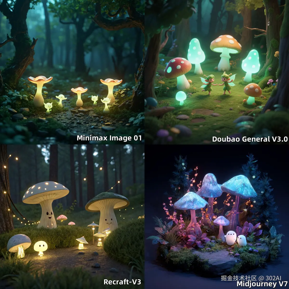 提示词:Create a 3D model of a whimsical forest clearing containing five uniquely shaped glowing mushrooms and two small, friendly forest sprites. The mushrooms should emit a soft, bioluminescent light, and the sprites should be depicted in a playful, interactive pose. The entire scene should be rendered with a high degree of detail and volumetric lighting to emphasize the 3D environment