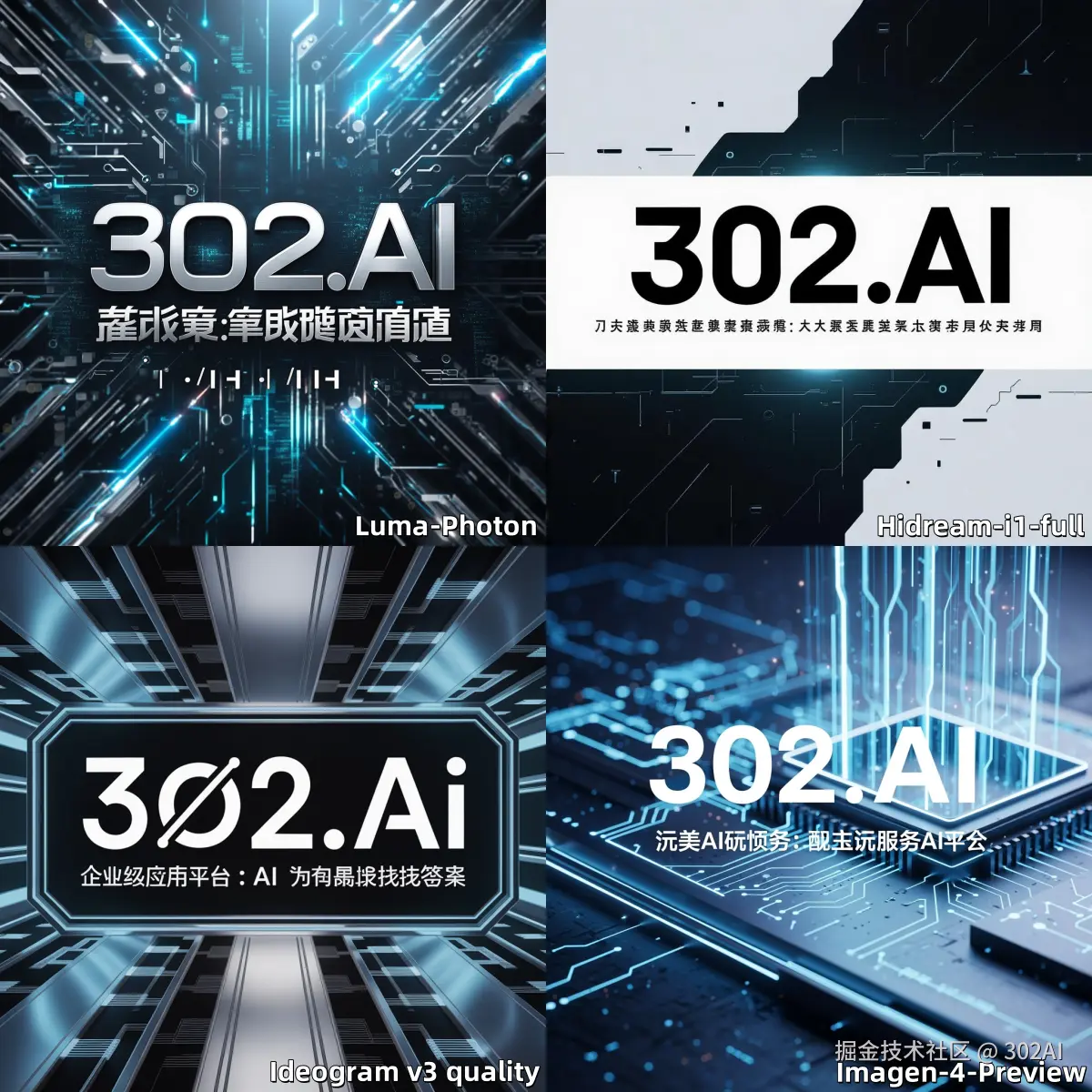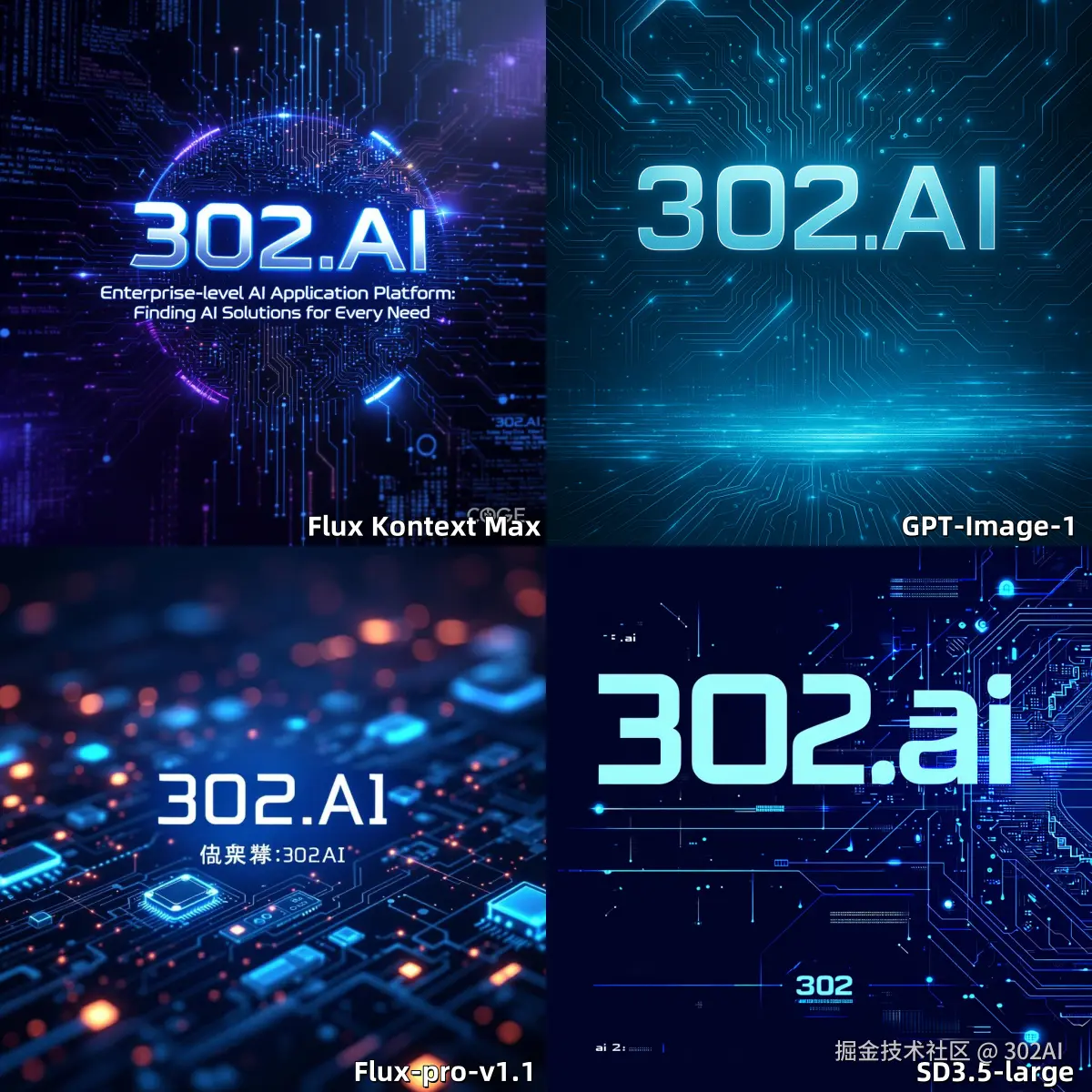 提示词:Create a futuristic, high-tech poster for '302AI'. The main title should prominently display '302AI' in a bold, modern font. The subtitle, ' 企业级 AI 应用平台:让 AI 为每个需求找到答案 ', should be integrated subtly yet legibly, perhaps in a smaller font below the main title or along the bottom edge. The overall design should embody a 'Modern technological style' and 'Futuristic Tech' , featuring elements like glowing circuit board patterns, abstract data streams, and a sleek, metallic color palette with electric blues and silvers. The composition should convey innovation, reliability, and the platform's comprehensive AI service offering.