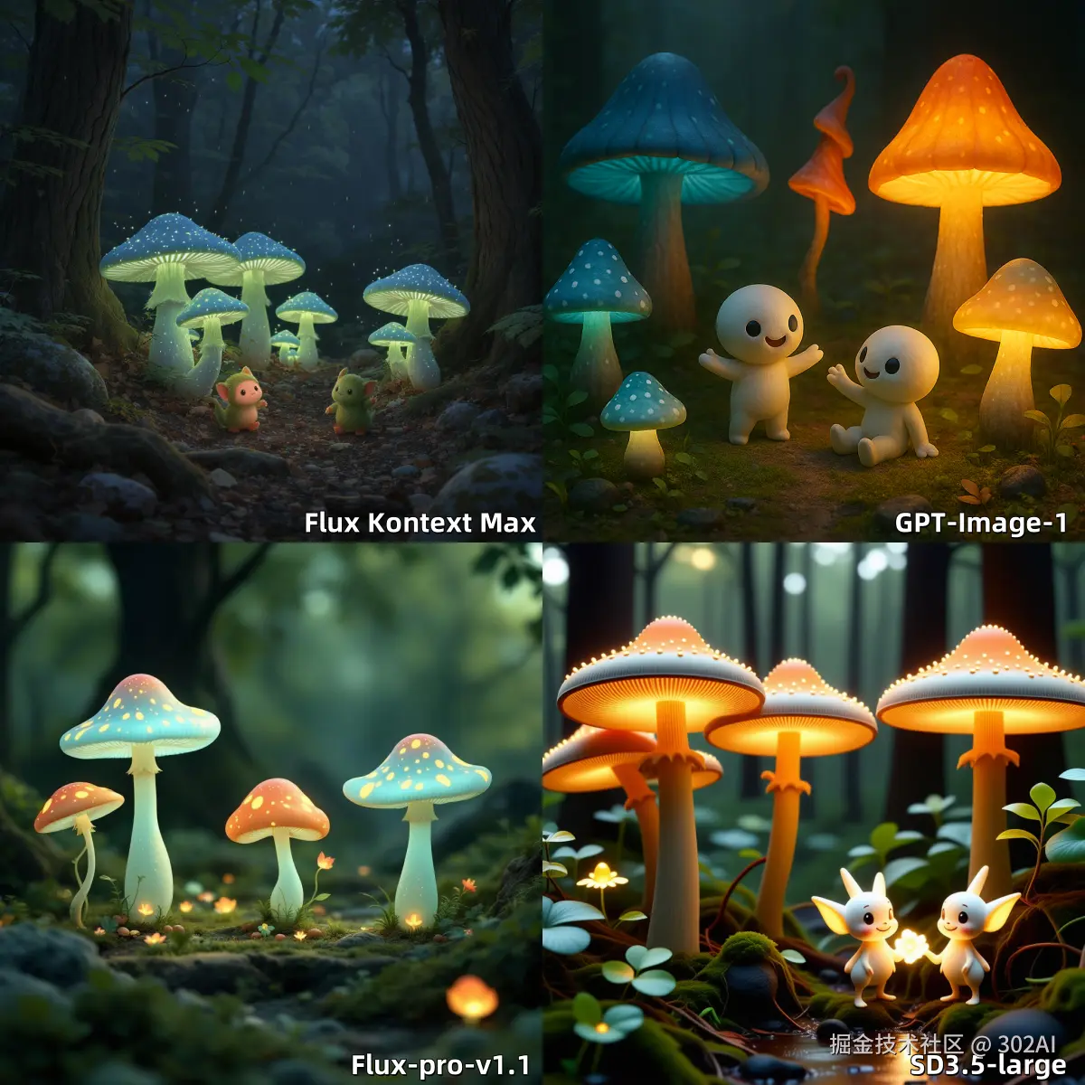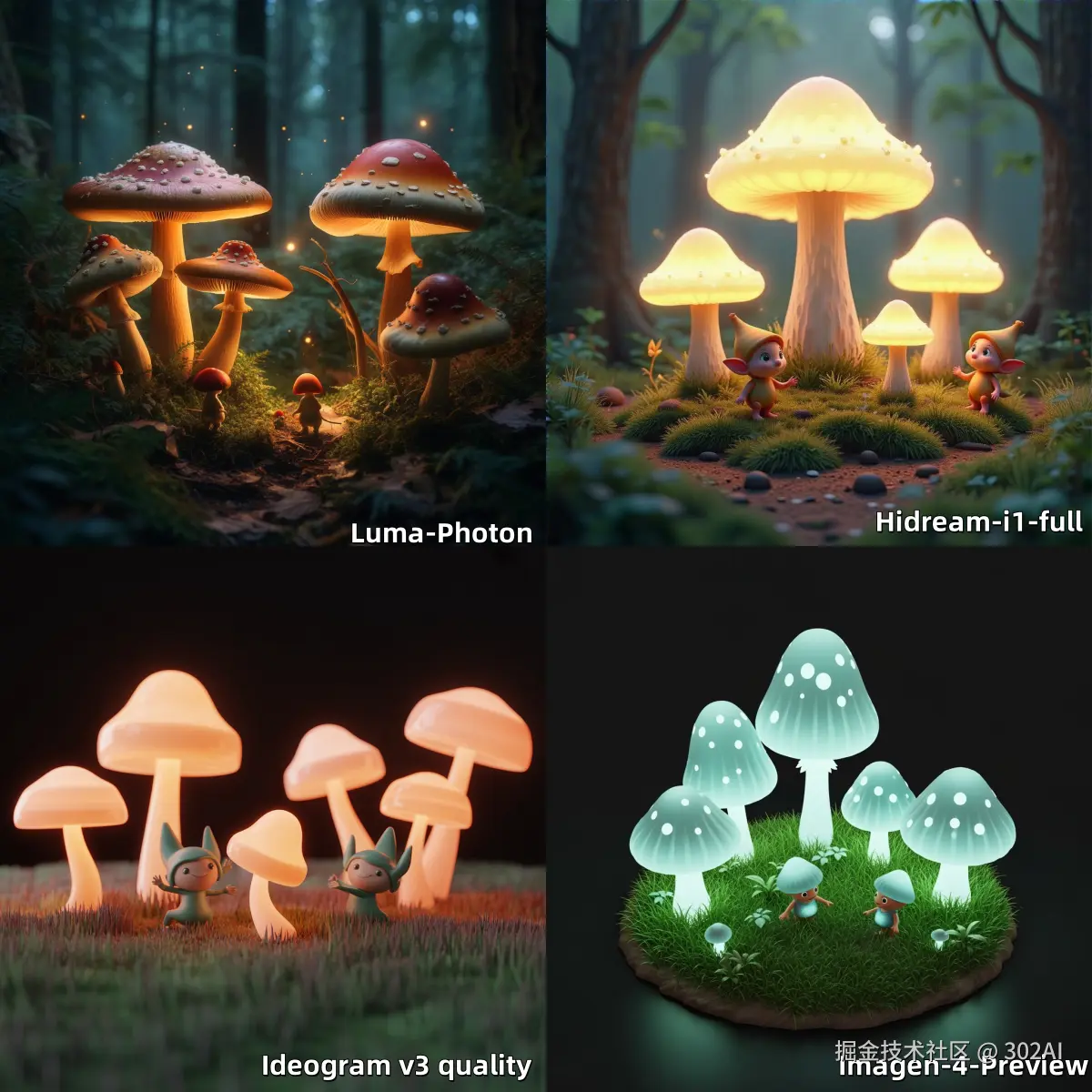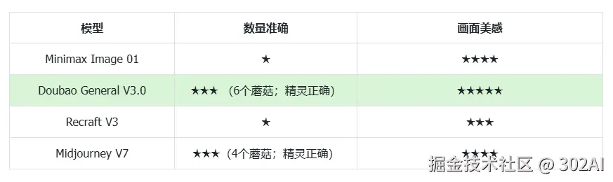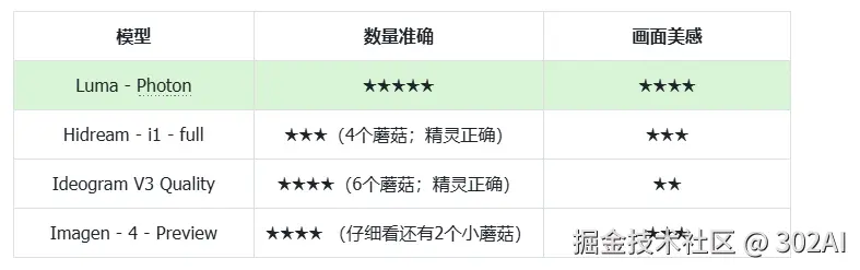- 数量单位准确度: 测试模型是否能依据提示词准确生成目标:5 个蘑菇,2 个小精灵。