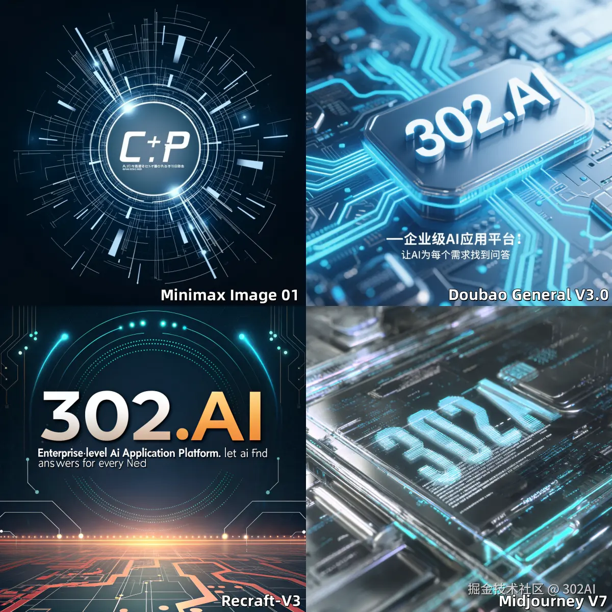 参考翻译:为 '302AI' 创作一张未来感、高科技的海报。主标题应以醒目、现代的字体突出显示 '302AI'。副标题 ' 企业级 AI 应用平台:让 AI 为每个需求找到答案 ' 应巧妙但清晰地融入其中,可以是主标题下方或底部边缘的小字体。整体设计应体现 ' 现代科技风格 ' 和' 未来科技 ',包含发光的电路板图案、抽象的数据流以及带有电光蓝和银色的时尚金属色调。构图应传达创新、可靠性以及平台全面的 AI 服务