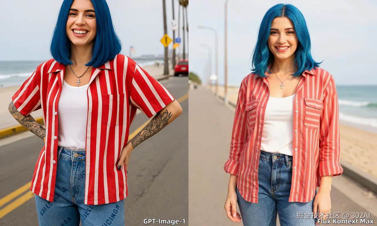 两个模型的生成质量差距非常小,人物一致性方面均保留了原图人物的五官风格,细节差异在于 Flux 对于模特左臂纹身未有体现,并改变了模特美甲的颜色。整体画面风格 GPT 会有着更高的饱和度,对比度带来的立体感。背景中路牌,车辆的生成也增加了画面的丰富性与真实感。整体上 GPT 略胜。
