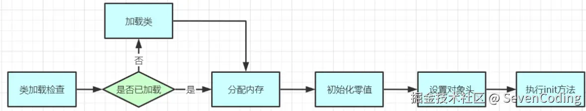 虚拟机遇到⼀条 new 指令时,⾸先将去检查这个指令的参数是否能在常量池中定位到这个类的符号引⽤,并且检查这个符号引⽤代表的类是否已被加载过、解析和初始化过。如果没有,那必须先执⾏相应的类加载过程。类加载过程包括了加载、连接、初始化三个阶段,其中连接还可以分为验证、准备、解析