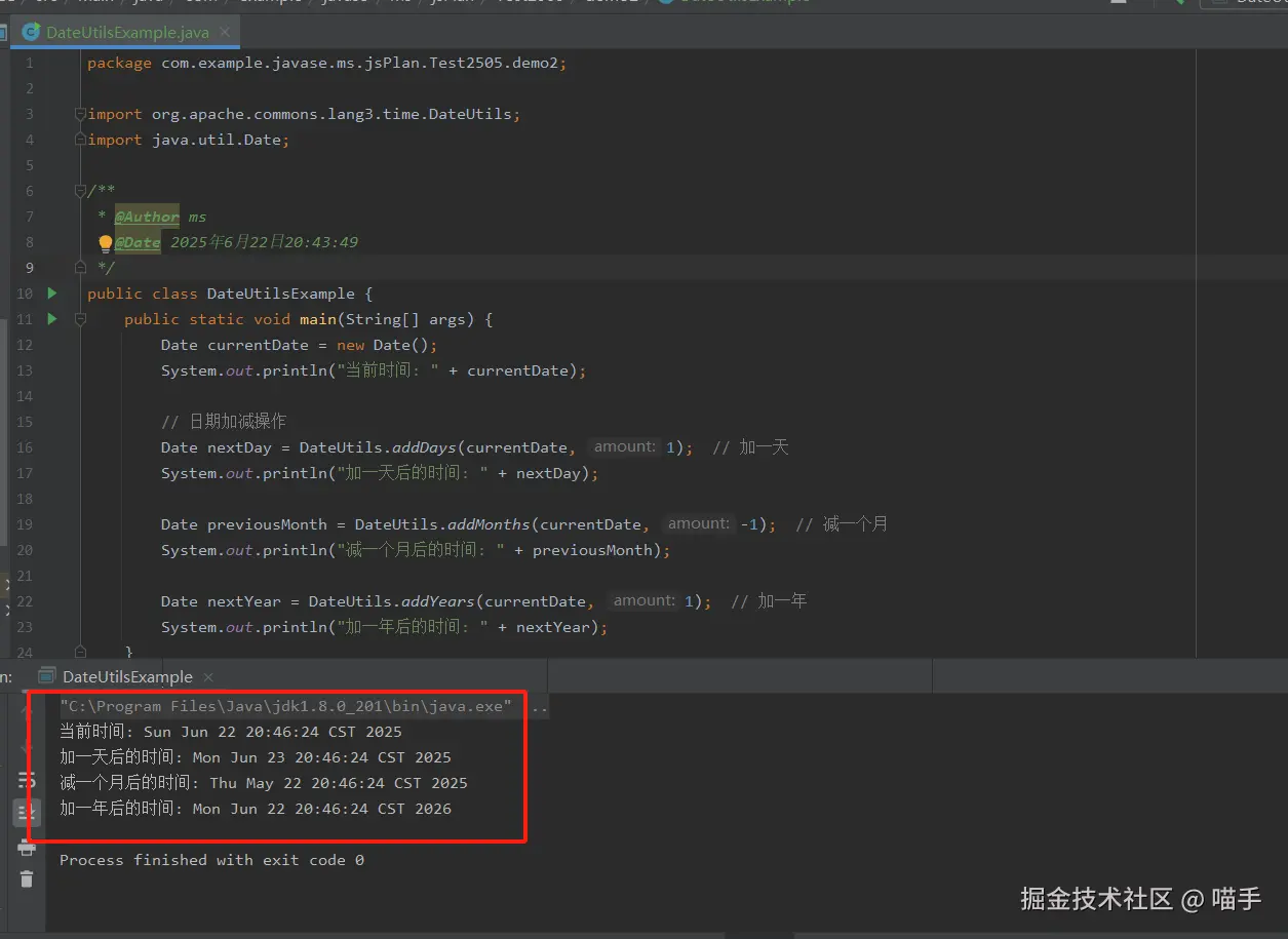 Date是 Java 中较早期用于处理时间的类,但功能有限。DateUtils是一个辅助工具类,简化了日期加减的实现。- 这些方法都是“不可变操作”:原始日期