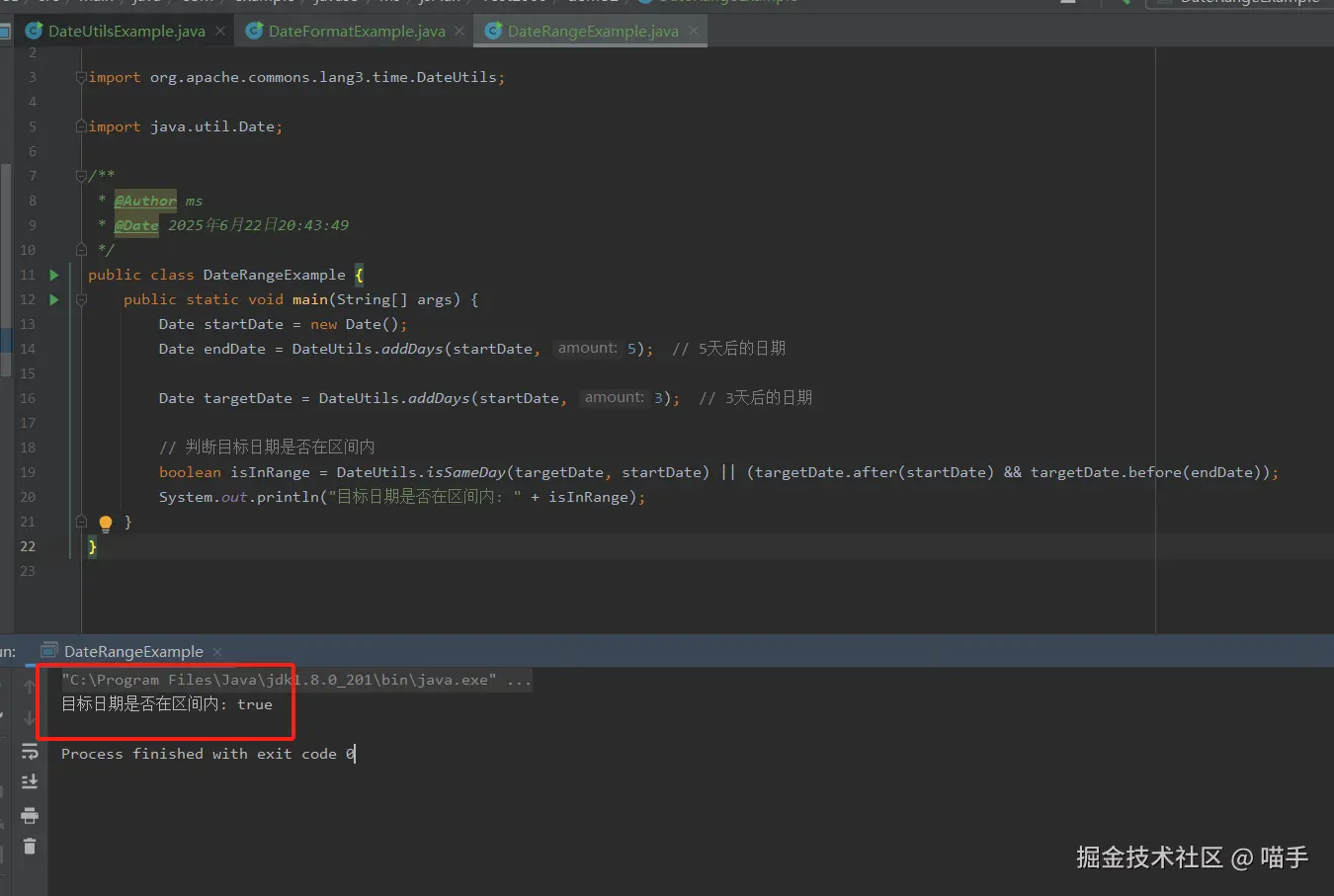 最终判断结果会打印出来,显示“目标日期是否在区间内”。