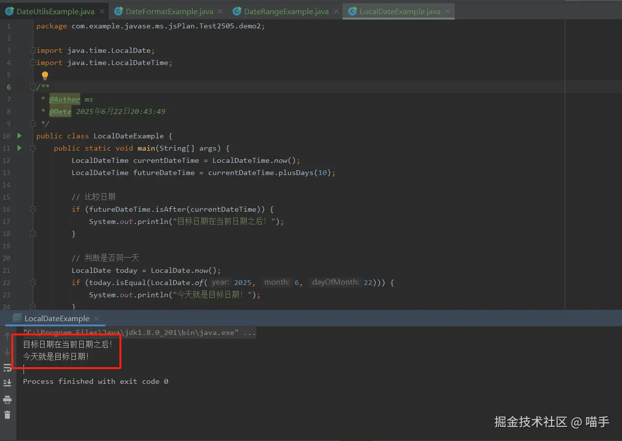 接下来,程序使用 LocalDate(只包含年月日,不含时间)获取今天的日期,并与一个固定的目标日期进行比较,这里目标日期是“2025 年 6 月 22 日”。