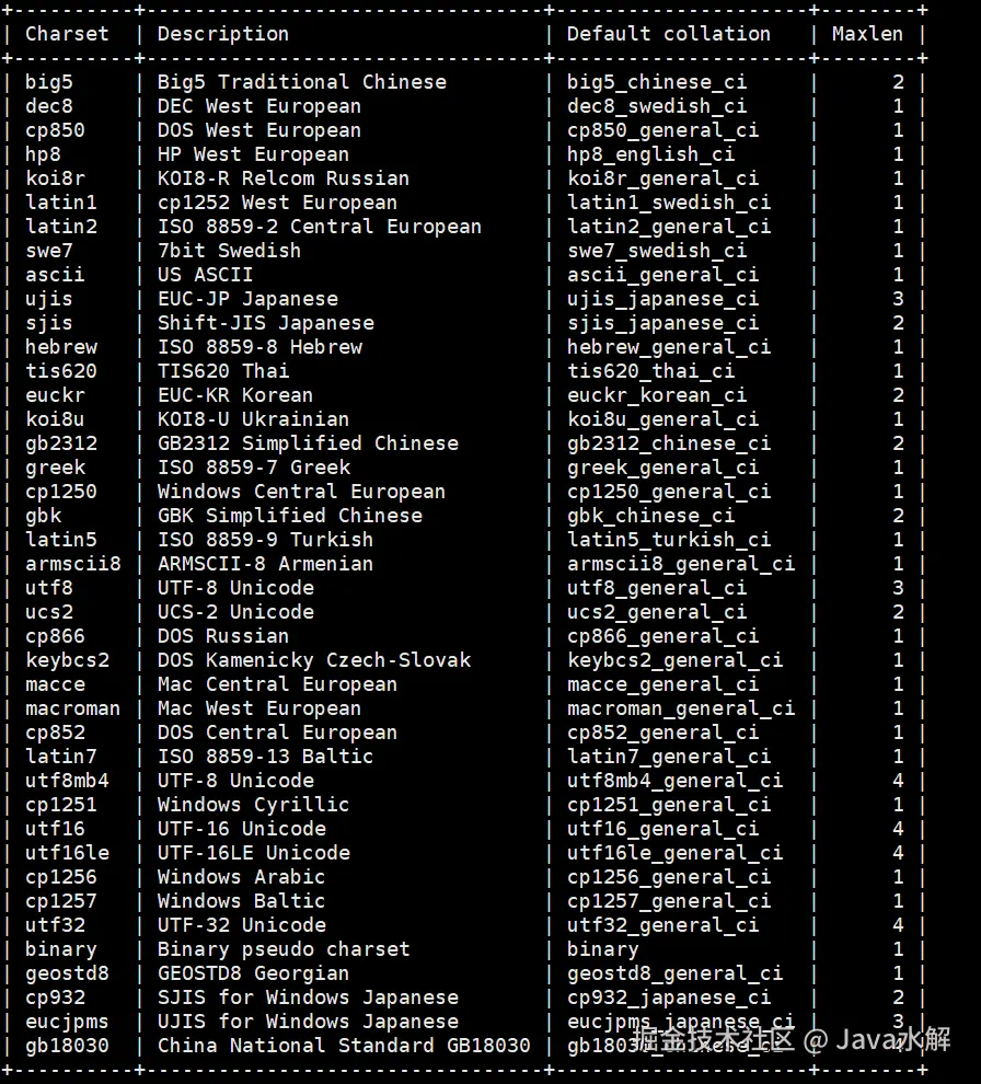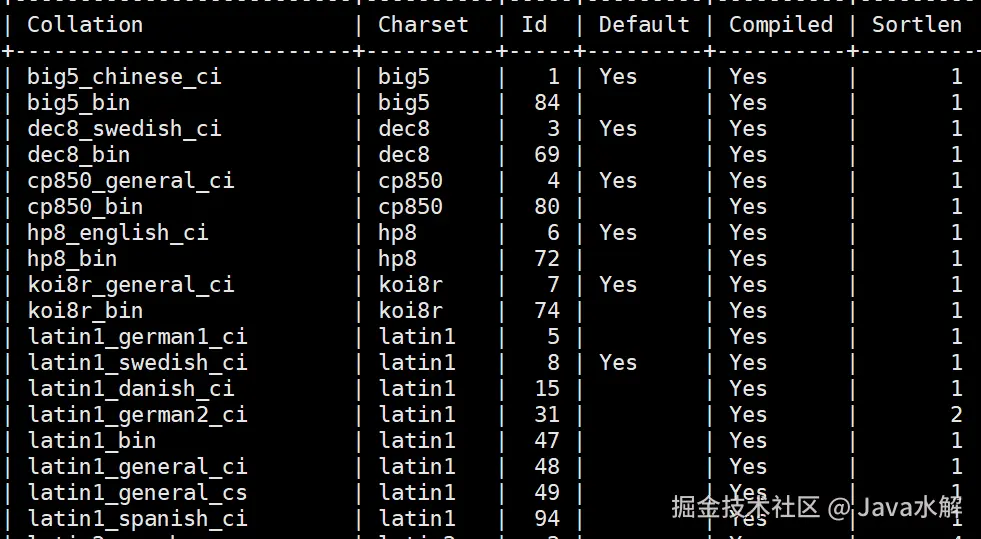 看完了数据库可以支持的字符集,我们当然也不能忘了字符集校验准则,同样的,一行代码我们也可以了解。
