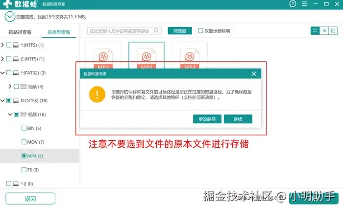 注意:选择的位置不能是恢复文件原本的位置,如果选错会有提示框出现。