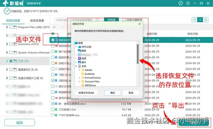 步骤2: 等待软件扫描结束后,在软件的指定位置勾选出自己需要恢复的文件,点击“导出”;随后再在弹窗中选择恢复文件存在电脑的位置。