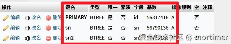 如上图所示,sn 和 sn2 这两个索引的基数(Cardinality) 竟然比主键 PRIMARY 的基数还要大!这在逻辑上是不可能的,因为主键是绝对唯一的,其基数应该等于总行数。