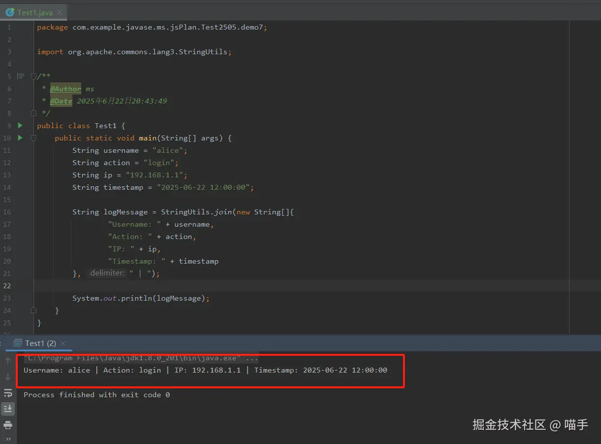 **小结:**这段代码展示了如何使用 Apache Commons Lang 的 StringUtils.join() 方法简洁地拼接字符串,适用于日志记录和信息输出等场景。