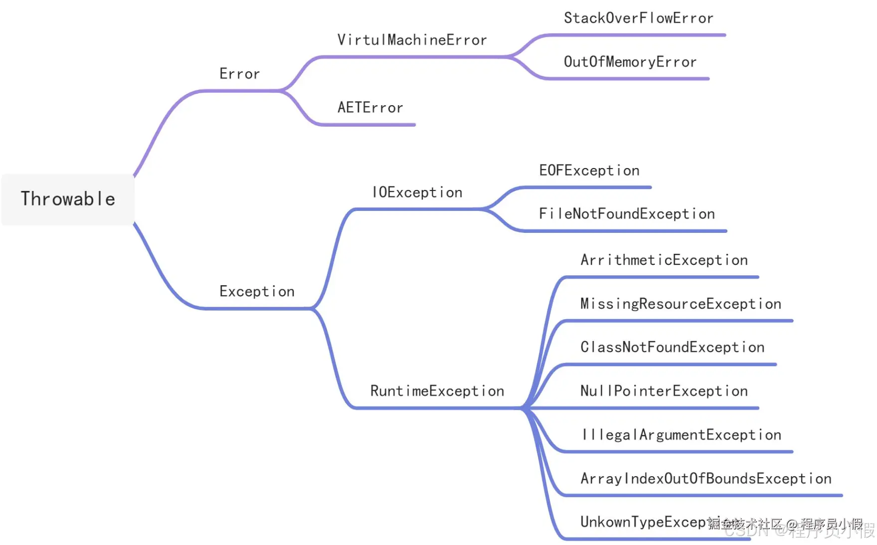 Error 和 RuntimeException 以及他们的子类。javac在编译时,不会提示和发现这样的异常,不要求在程序处理这些异常。所以如果愿意,可以编写代码处理(使用try…catch…finally)这样的异常,也可以不处理。对于这些异常,应该修正代码,而不是去通过异常处理器处理 。这样的异常发生的原因多半是代码写的有问题。如除0错误ArithmeticException,错误的强制类型转换错误ClassCastException,数组索引越界ArrayIndexOutOfBoundsException,使用了空对象NullPointerException等等。
