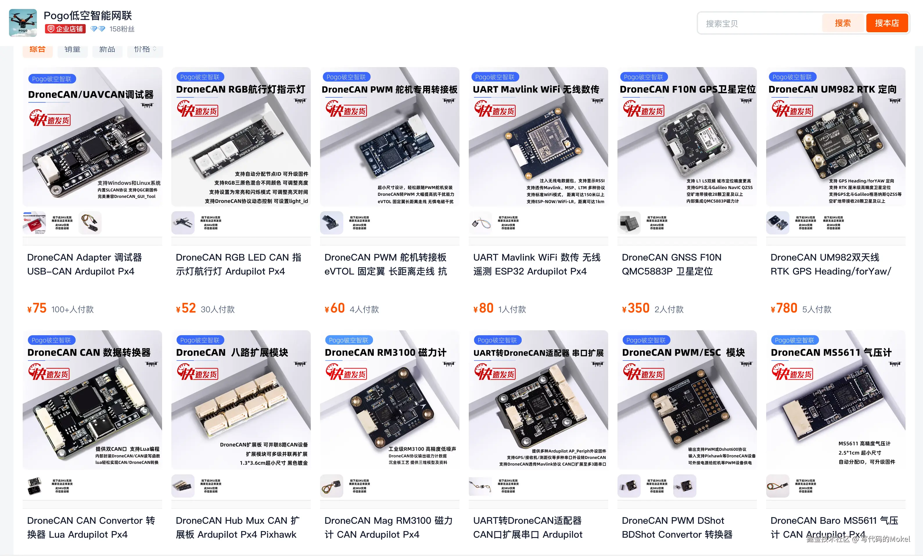 这个电调使用CAN总线作为通信方式,而通信协议则使用的是DroneCAN,DroneCAN协议目前是无人机领域应用较为广泛的CAN通信高层协议,被包括Ardupilot、Px4、亚马逊航空等在内的开源飞控和厂商自研飞控支持与集成,关于这个电调的更多的技术规格信息,你可以通过我们的网站( pogouav.com ),或者我们的店铺( shop384515901.taobao.com/ )详细了解,你也可以在我们的网站和店铺查阅更多的DroneCAN机载设备和DroneCAN开发调试工具。