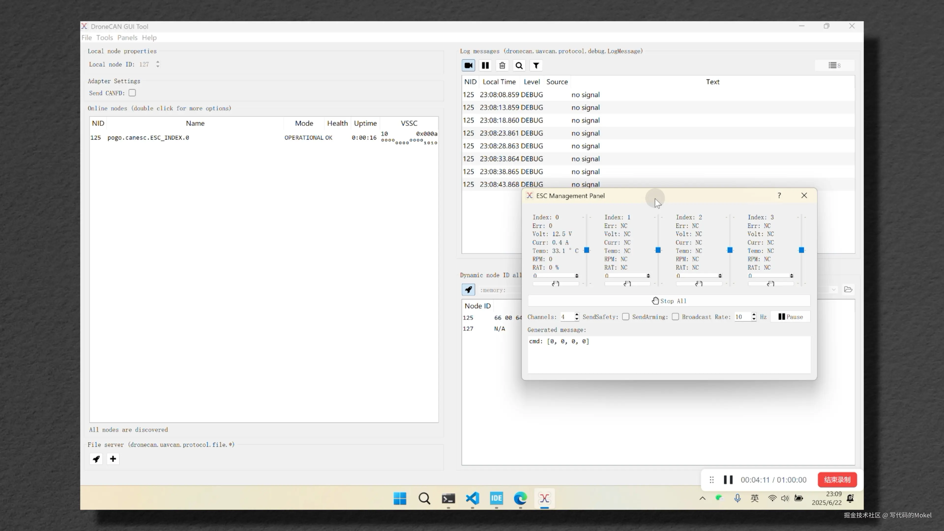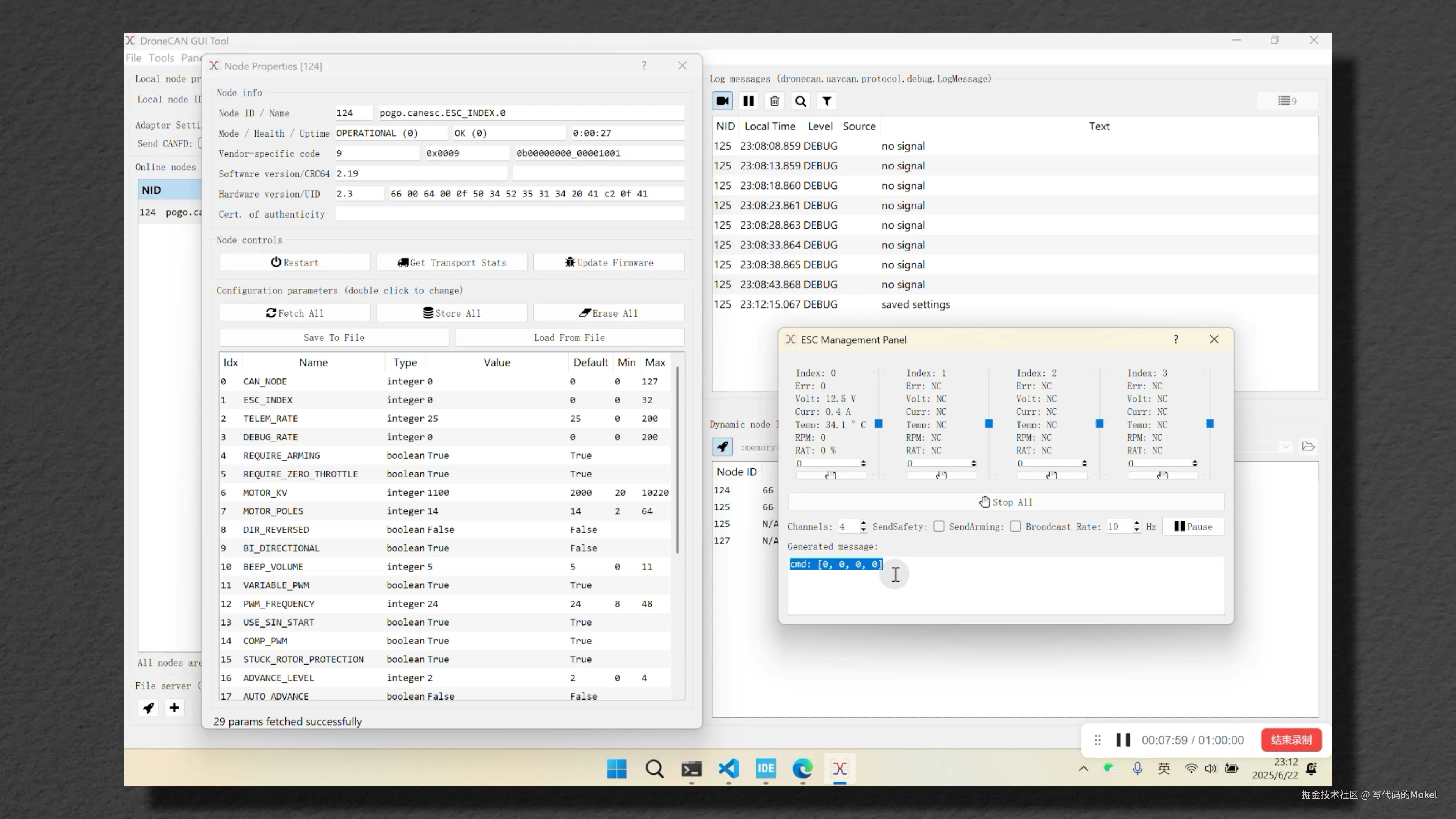 我们打开上位机的 Panels->ESC Panel工具框,这个时候上位机就开始往总线上广播DroneCAN油门指令,我们可以看到电调的节点状态已经更新为OPERATIONAL,这代表电调的firmware正在运行,并且电调的节点名称也更新为了真正的DroneCAN节点名称