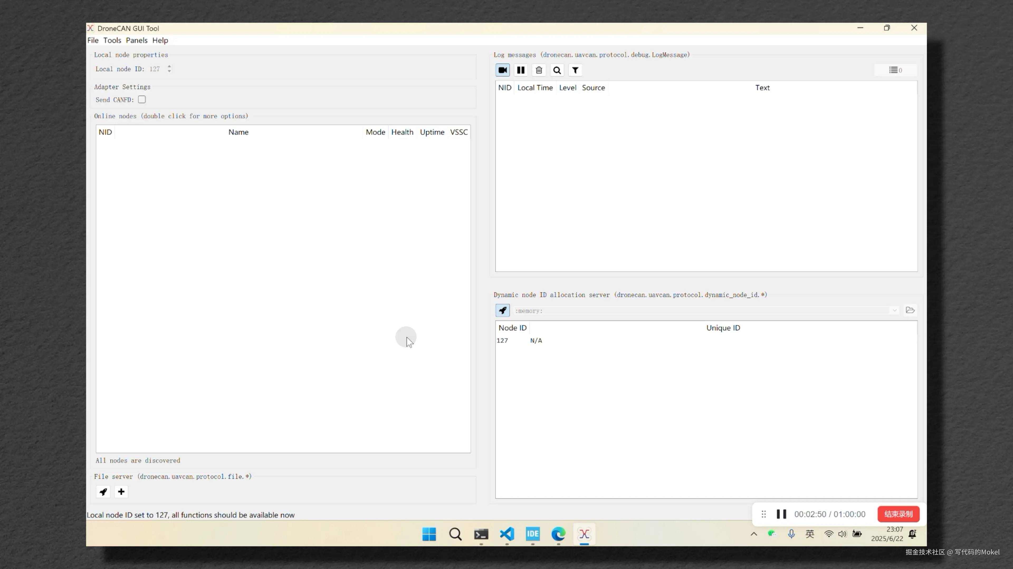 然后我们在电脑上打开DroneCAN GUI Tool上位机,选择DroneCAN调试器对应的端口,点击OK进入上位机,点击✅设置上位机的DroneCAN节点ID,点击🚀开启上位机的分配节点ID的功能,这个时候,在保证安全的情况下,包括电调没有连接电机,没有金属物品会导致电调短路等,然后给电调上电。