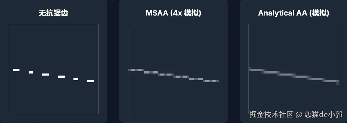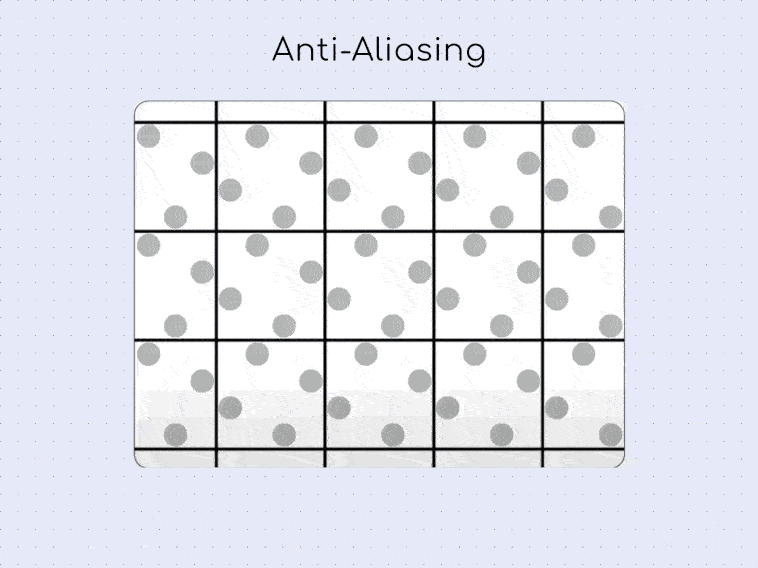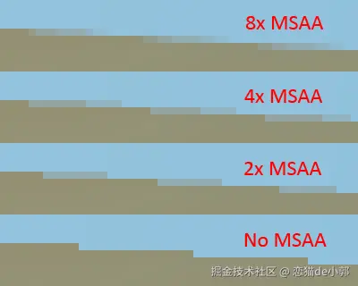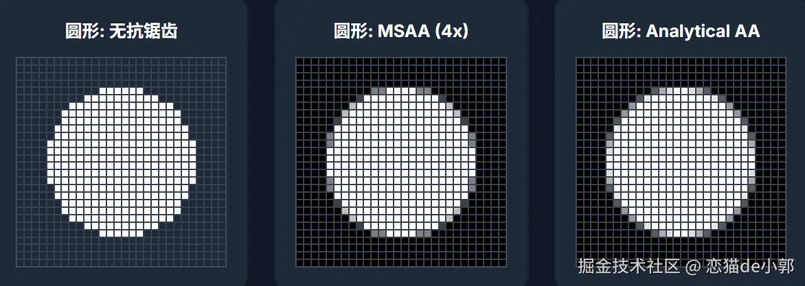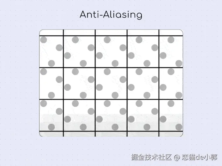 为什么说是在“呈现”被处理掉?核心在于 Impeller 使用了不一样的默认抗锯齿实现: 多重采样抗锯齿(Multisample Anti-Aliasing, MSAA) ,它会通过在每个物理像素内部采集多个样本点来计算最终颜色,从而产生比传统抗锯齿更平滑、质量更高的边缘: