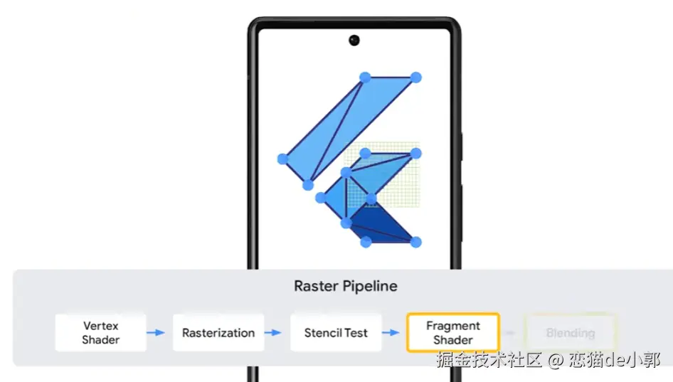 - CPU 端 Tessellation:Impeller 会在 CPU 上将所有需要绘制的图形——无论是圆形、圆角矩形、复杂的矢量路径,还是文本字形,全部预先转换为三角形网格(Triangle Mesh)