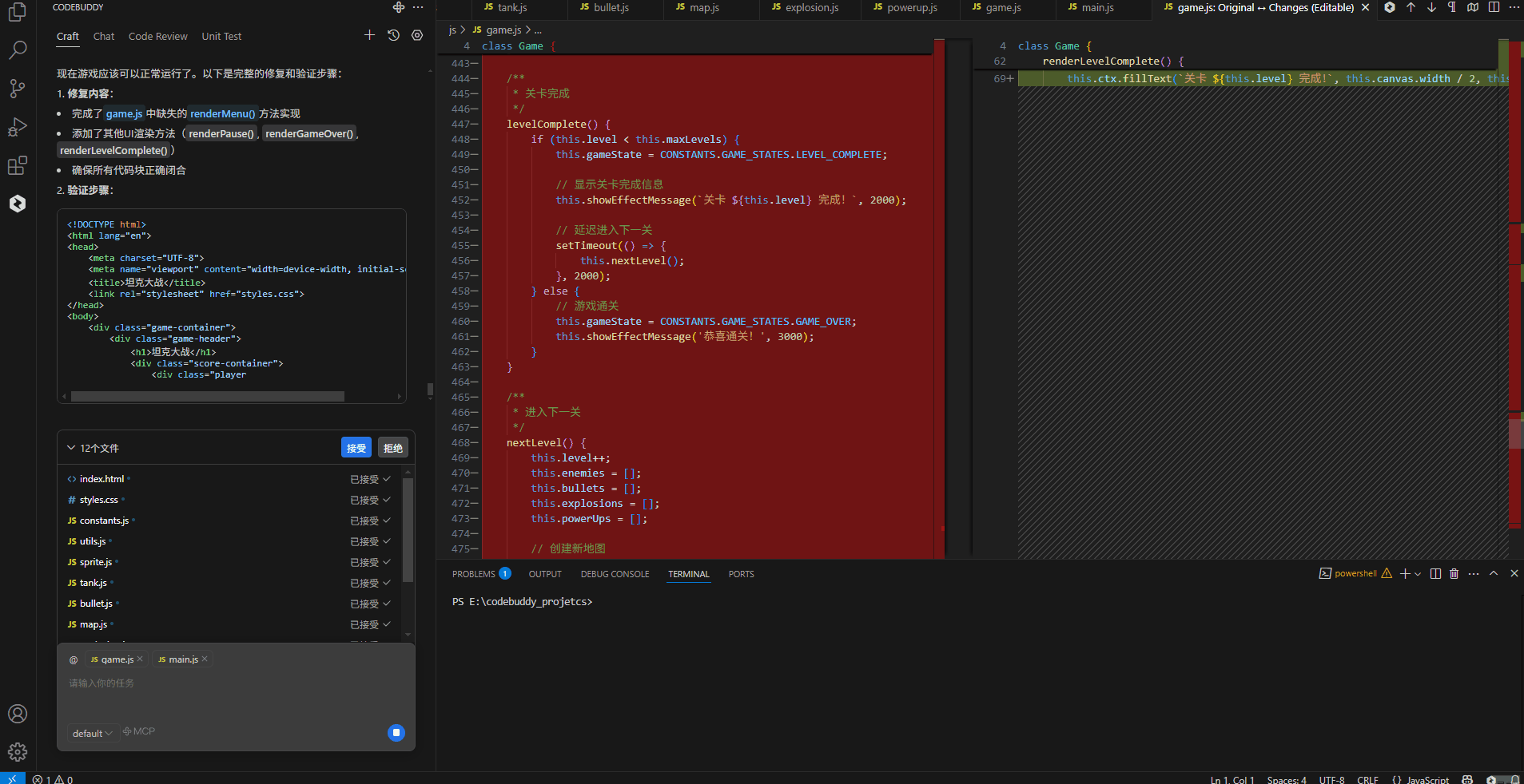 与其他的一些工具稍微不同的是,codebuddy并不是将所有的内容编排进同一个html页面或javascript脚本。他针对该需求,分析出所涉及到的可能的实体类,如坦克,子弹,地图等等。