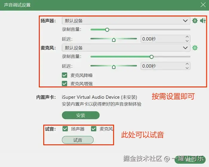 步骤2:选择需要录制的音频源,还可以在 “声音调试设置” 中设置录制的音量、开启麦克风降噪等。设置完毕后点击 “REC” 就可以开始录音了。